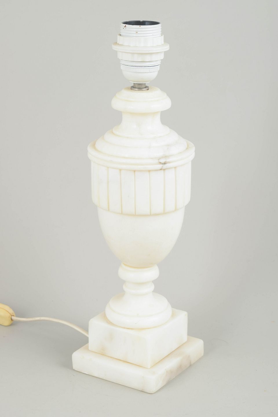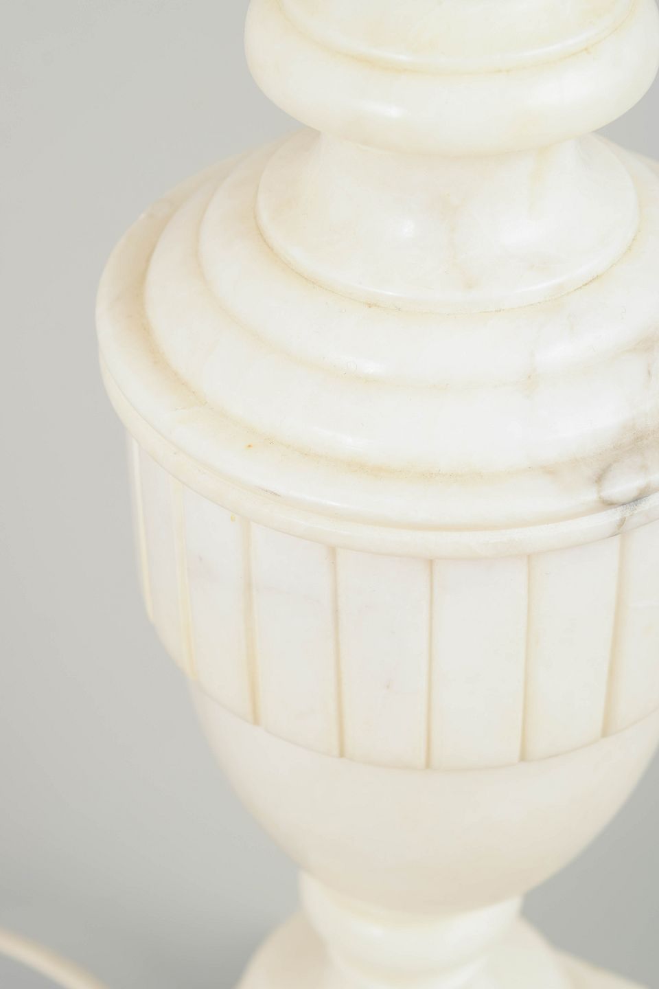 Classically shaped table lamp in white marble, featuring a clearly profiled top section and vertical fluting around the mid-body. The simple baluster form and square base create a balanced and timeless appearance.