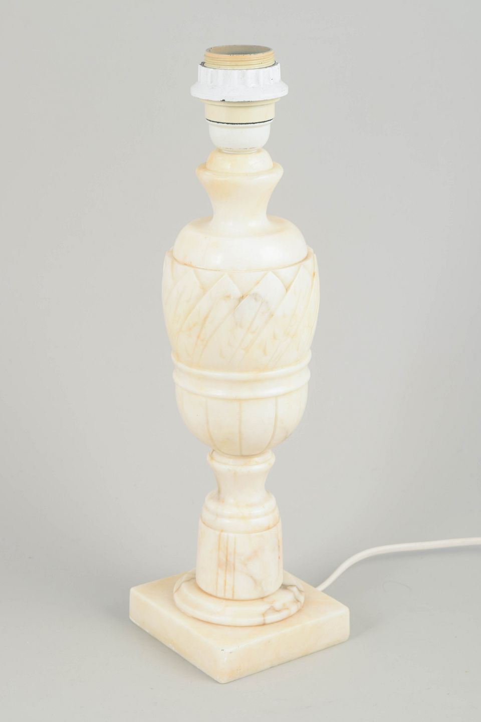 Decorative table lamp in light marble featuring carved diamond and vertical facet patterns that lend a classic, elegant form. The square base and soft proportions enhance the lamp’s sculptural presence.