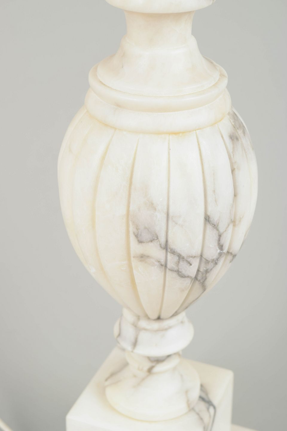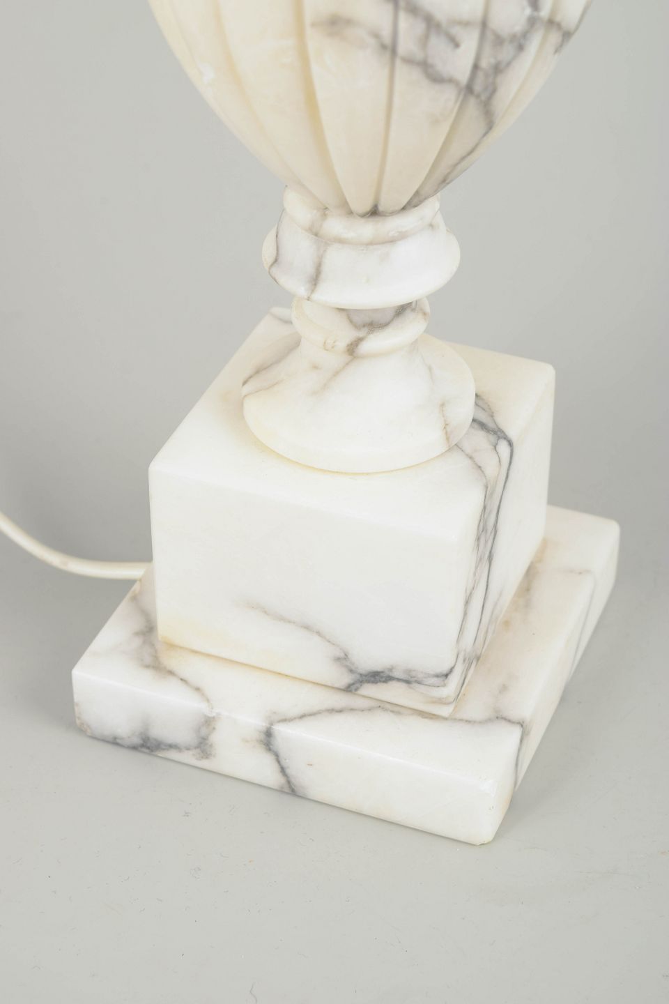 Elegant bordlampe udført i hvid marmor med markant årestruktur og klassisk balusterformet midterstykke. Den profilerede fod og de bløde, vertikale facetter giver lampen et raffineret og dekorativt udtryk.