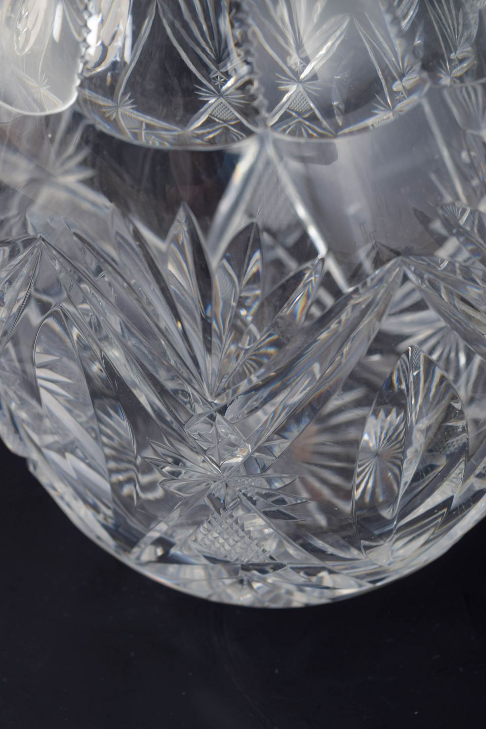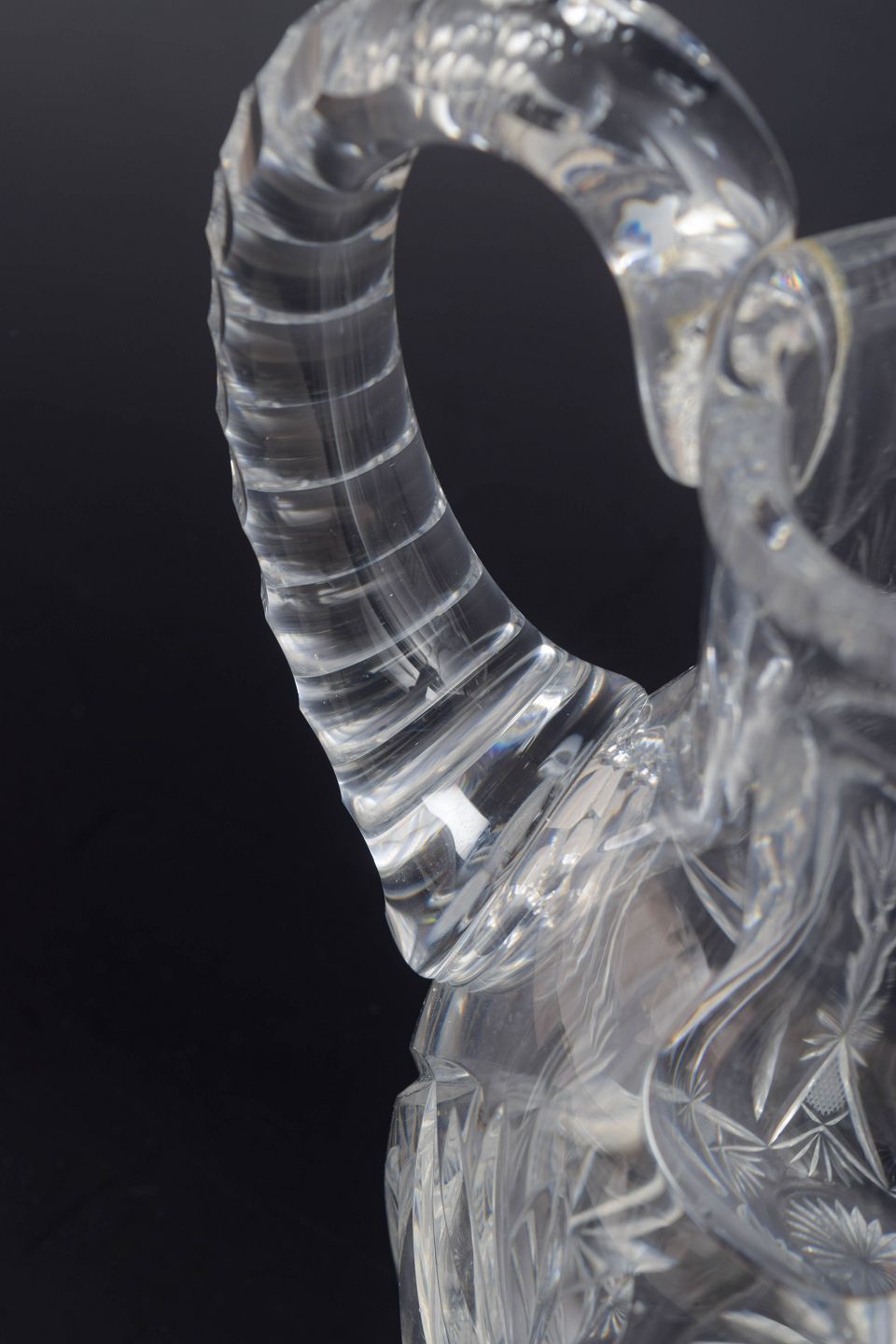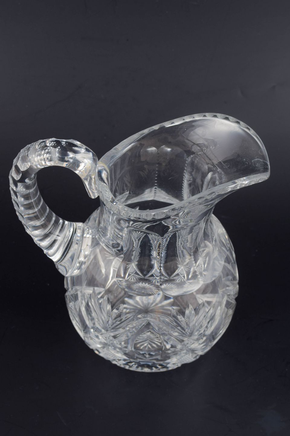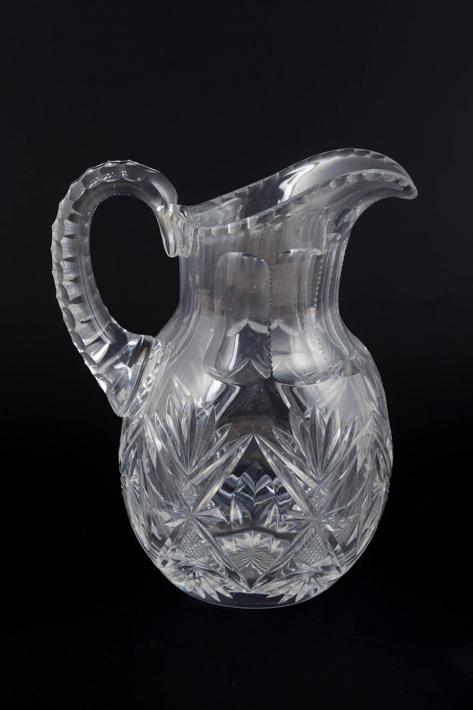 Elegant and substantial pitcher in clear crystal glass with deep cut star and leaf patterns. The weight, clarity and strong decorative cutting give the piece a classic interwar-era character.