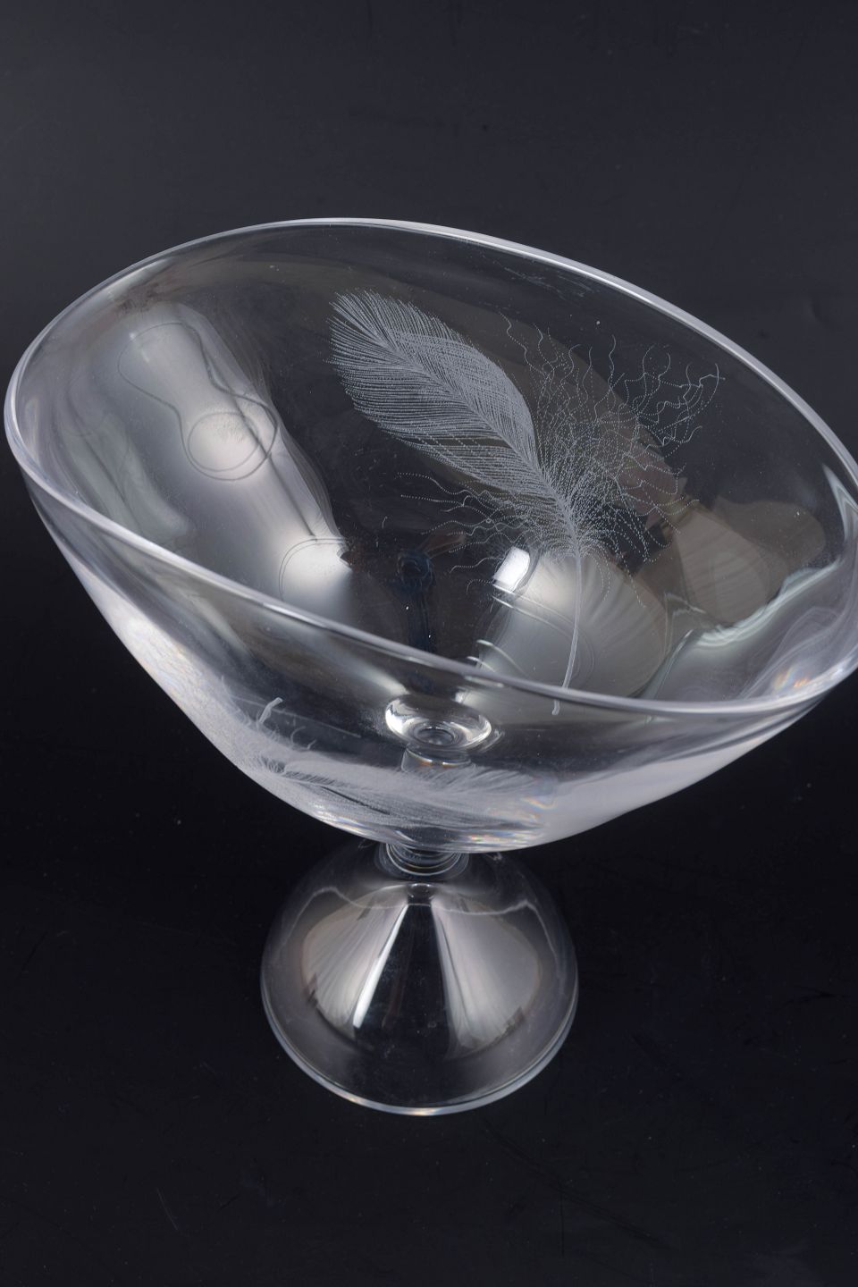Elegant footed bowl featuring feather-like decorative strokes within the glass. The motif is a decorative technique used by Kosta, not an official model name. The asymmetrical form and tall, double-shaped stem lend the piece a modern, sculptural presence.