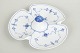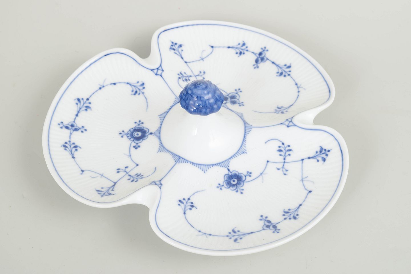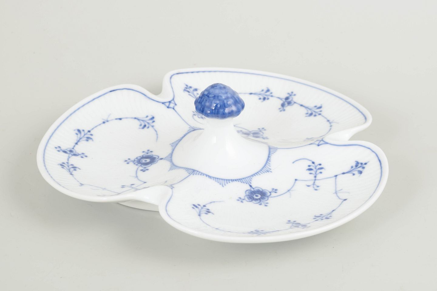 Rare cabaret dish in the Blue Fluted Plain pattern, made in a smooth form without lace border and decorated with hand-painted cobalt blue underglaze. The dish is divided into three compartments with a central knob, suitable for small servings, snacks, or sweets. An unusual and decorative model from the interwar period.
