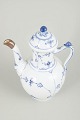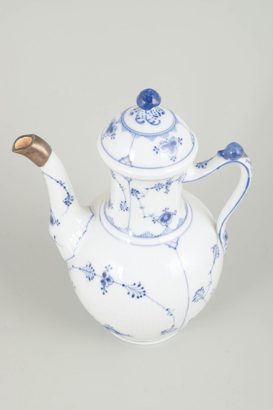 Classic coffee pot in the Blue Fluted Plain pattern, made in a smooth fluted form without lace border and decorated with hand-painted cobalt blue underglaze. The spout is fitted with a silver mount, likely applied to conceal a small chip—an historically common and practical repair that extended the life of the piece.