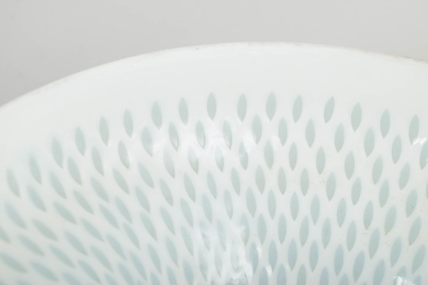 Large, elegant bowl in white porcelain with pierced “rice porcelain” decoration, where the fine perforated pattern creates a light and translucent effect. The balanced conical form and subtle surface treatment are characteristic of Friedl Holzer-Kjellberg’s modernist designs for Arabia.