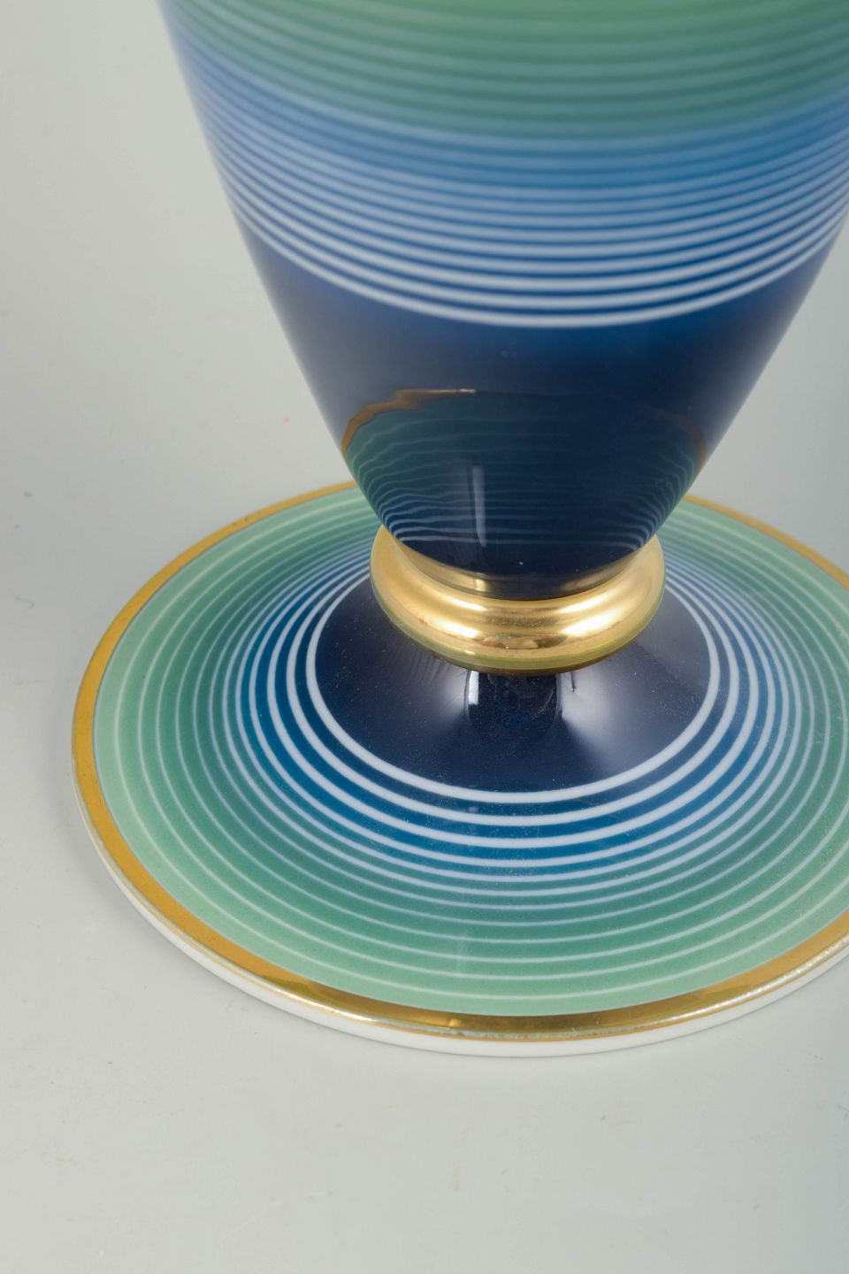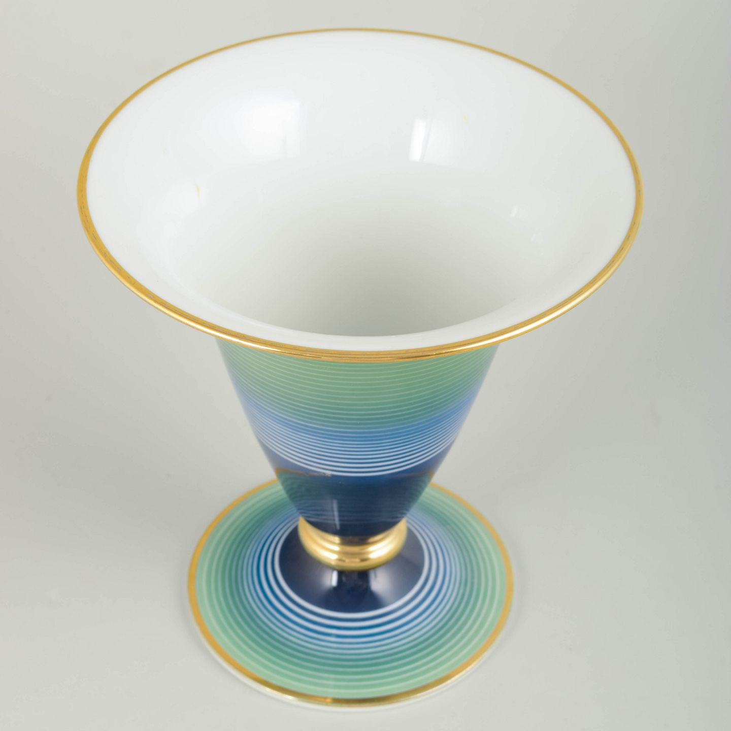 Elegant Art Deco porcelain vase with a conical form, decorated with fine horizontal lines in graduated shades of blue and green. The shape and colour transition are characteristic of Rosenthal’s Art Deco production, where strict geometry is combined with refined glaze work and subtle gilded details.