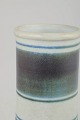 Slim and elegant stoneware vase from Gunnar Nylund’s “Banderillo” series, characterized by pronounced horizontal bands in blue-green and darker tones set against a light ground. The carefully balanced form with a gently narrowed neck gives the vase an architectural and rhythmic appearance, typical of Nylund’s work during the 1960s.
