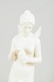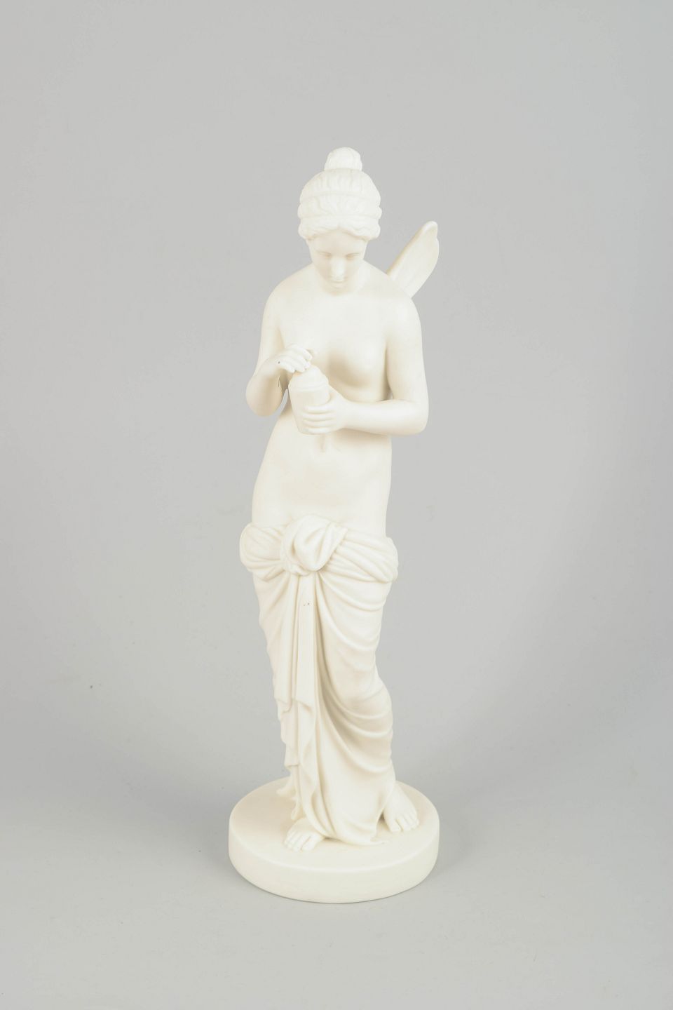Biscuit porcelain sculpture depicting Psyche, the mythological spirit and goddess of the soul. The figure is executed in unglazed, matte porcelain with a classical expression, finely modelled anatomy and softly rendered drapery. Psyche is shown standing with wings and holding a small vessel. Produced at Gustavsberg around 1900.