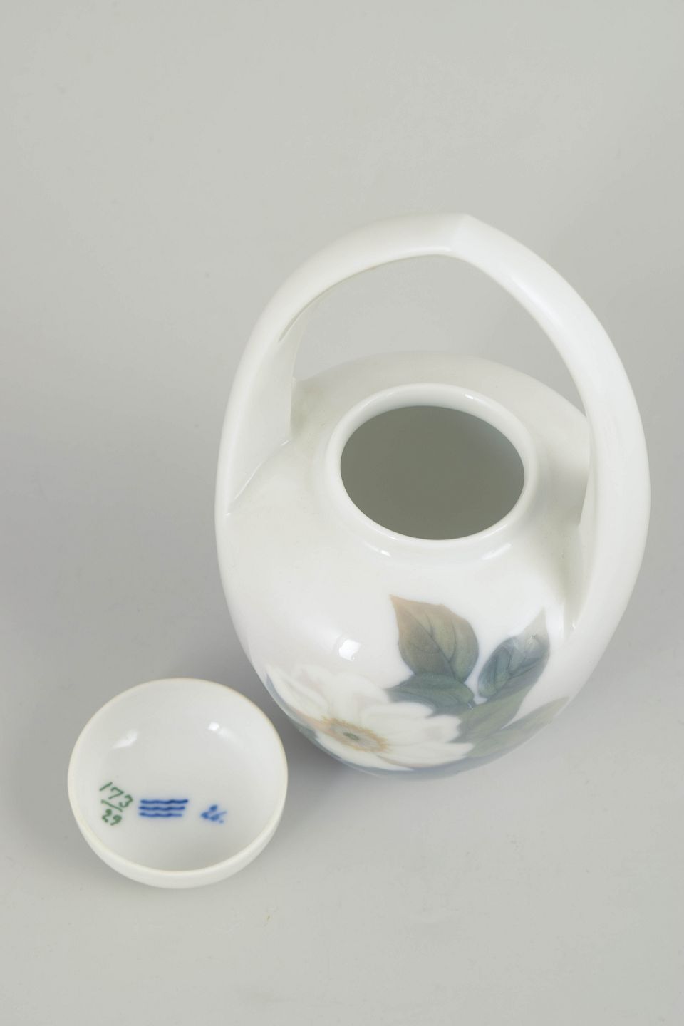 Lidded porcelain vase with integrated handle, decorated with hand-painted underglaze in Art Nouveau style featuring floral and foliage motifs in subdued blue and green tones. Model 1378/29.