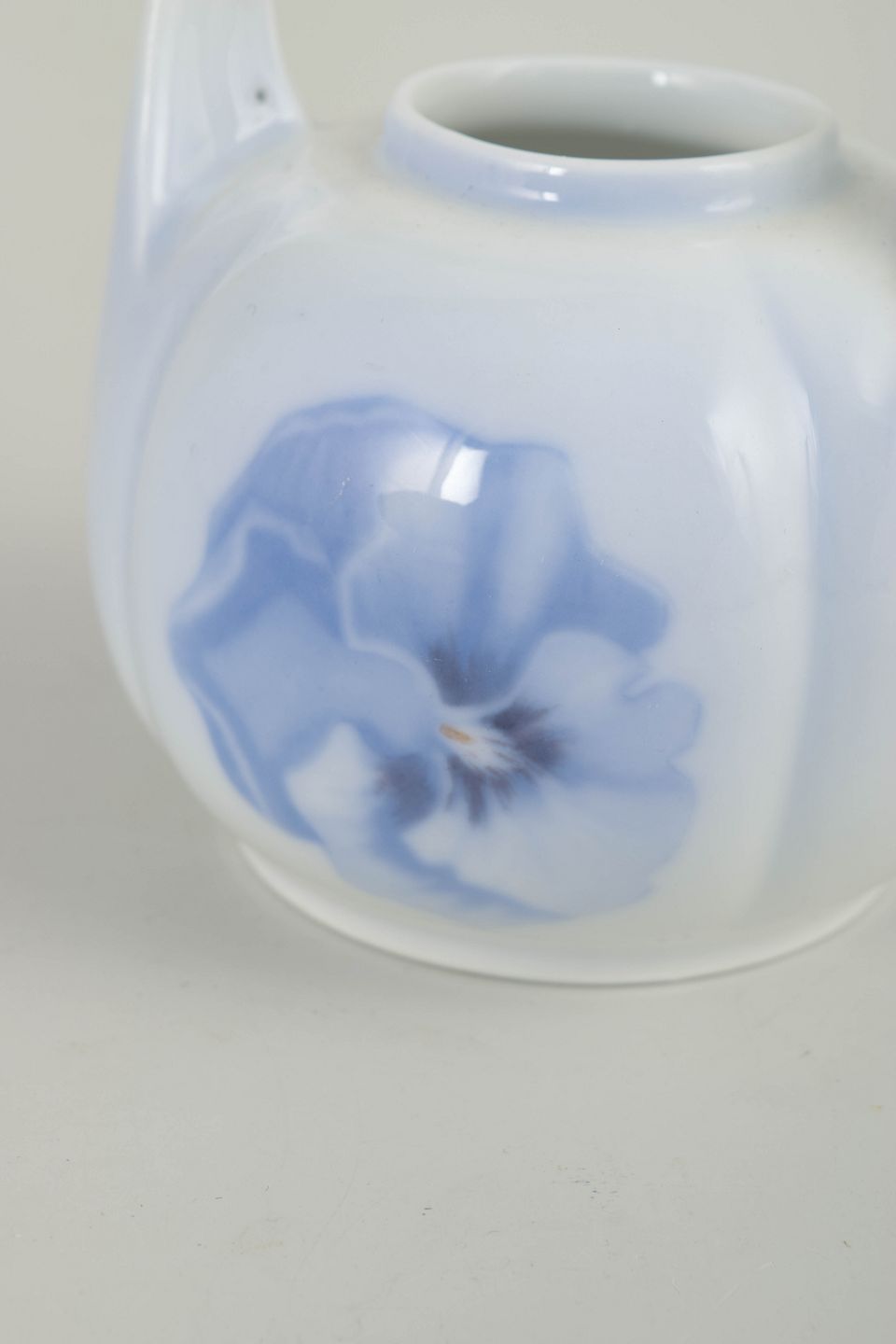 Porcelain vase with integrated handle and hand-painted underglaze decoration in Art Nouveau style, featuring a stylised floral motif in soft blue tones. Produced after Royal Copenhagen model 238/29b.