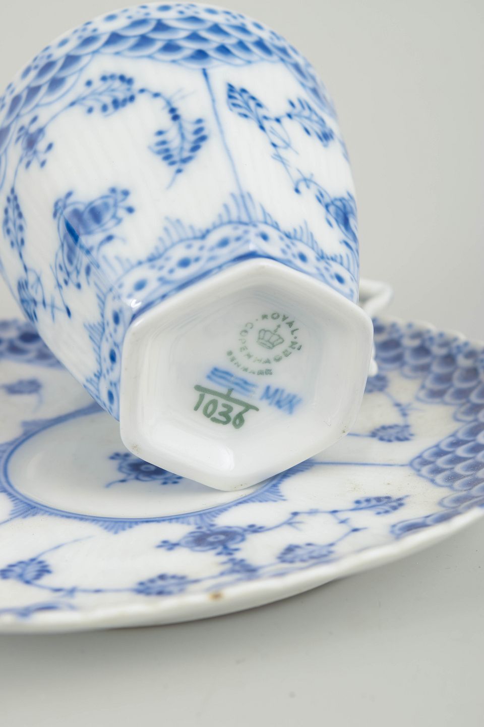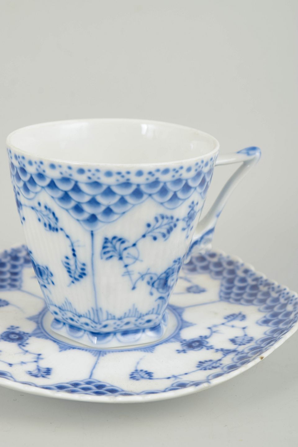 Royal Copenhagen, Blue Fluted Full Lace coffee cup with saucer.