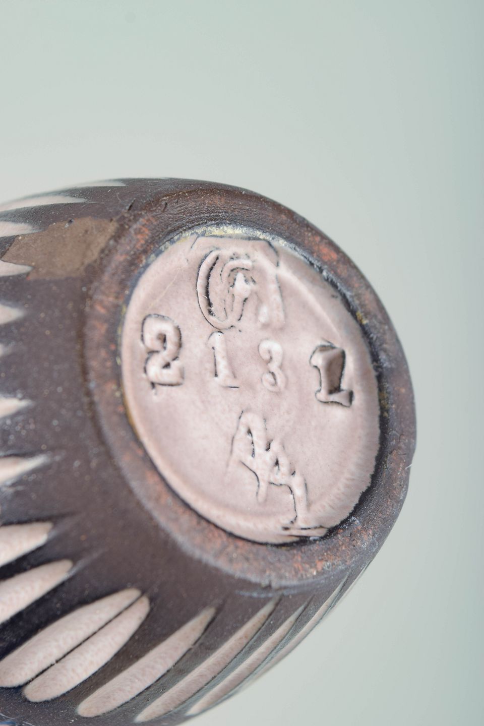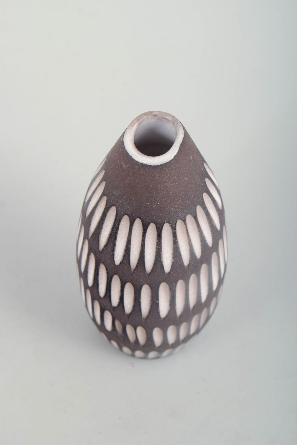 Slender oval-shaped glazed ceramic vase with a tapering neck. The body is decorated with repeated vertical oval motifs in white against a dark brown ground glaze, creating a rhythmic and graphic expression characteristic of Scandinavian modernism. Model number 2131.