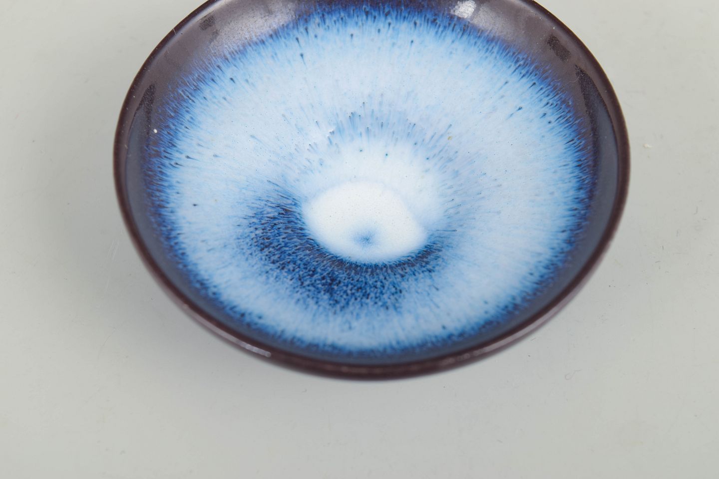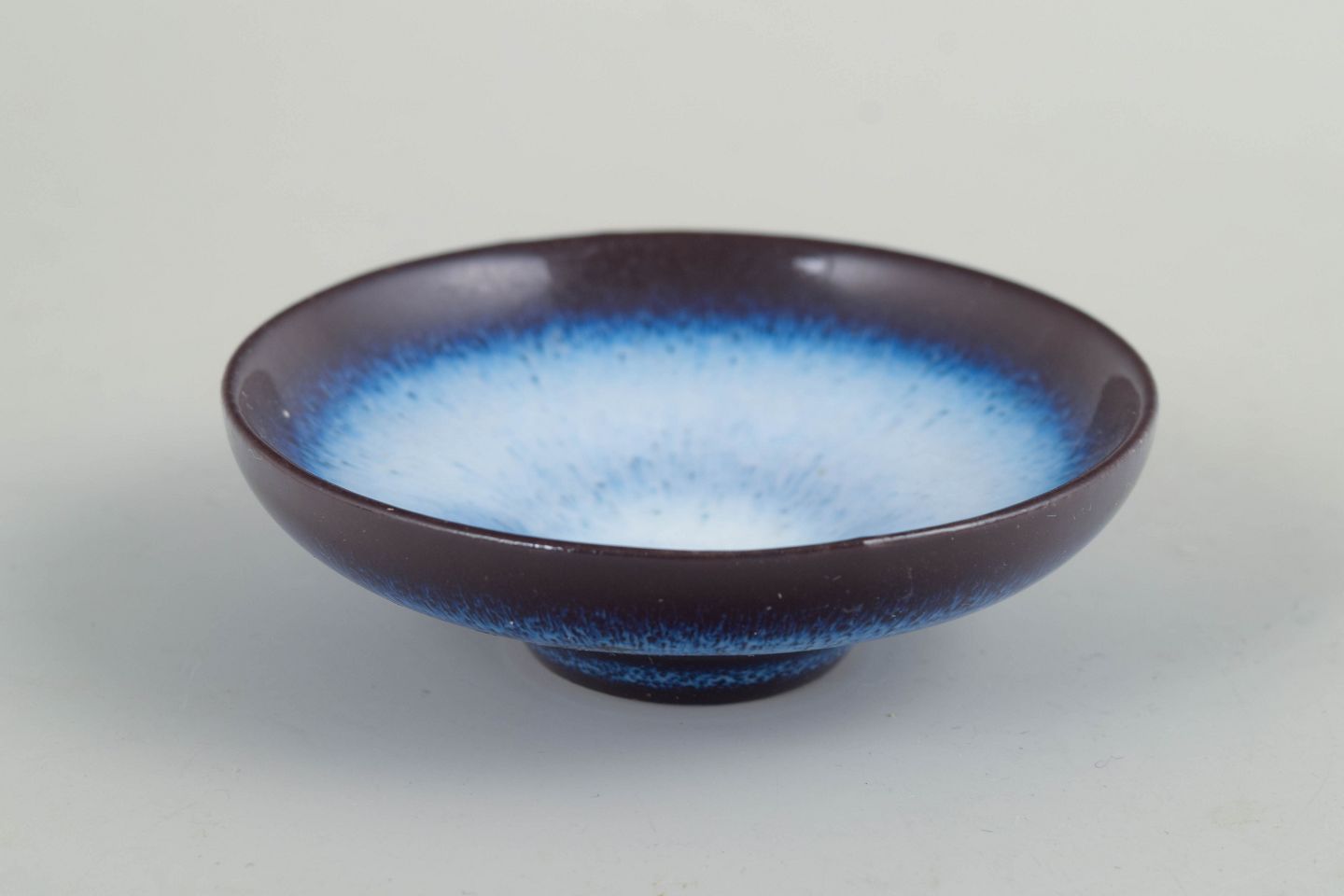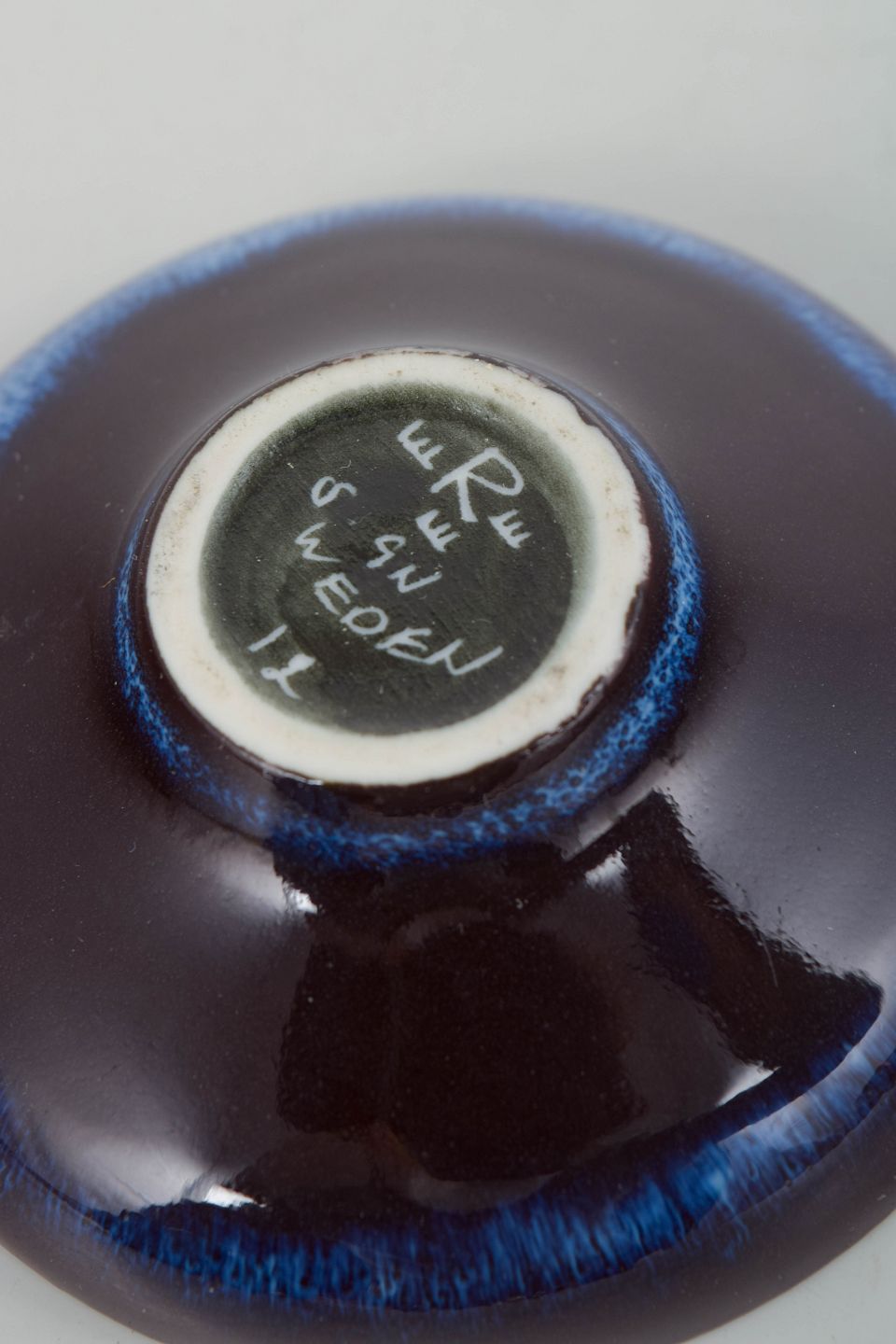 Small shallow bowl in glazed stoneware with a softly rounded profile. Finished with a dark outer rim and a luminous blue interior glaze, reflecting Gunnar Nylund’s refined approach to colour and surface in reduced-scale works. The compact proportions emphasise the miniature nature of the piece.