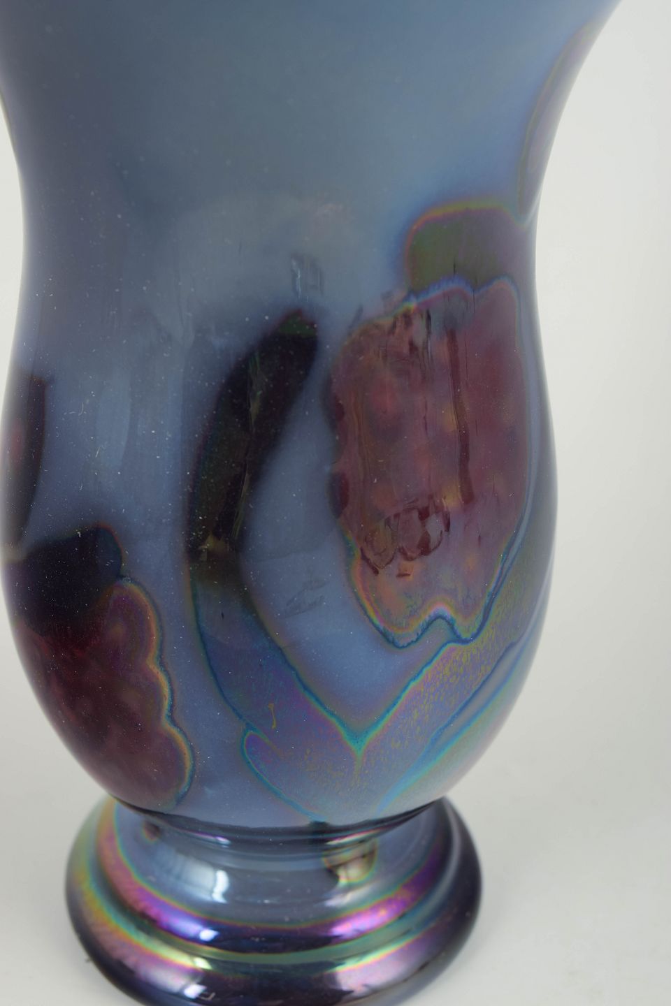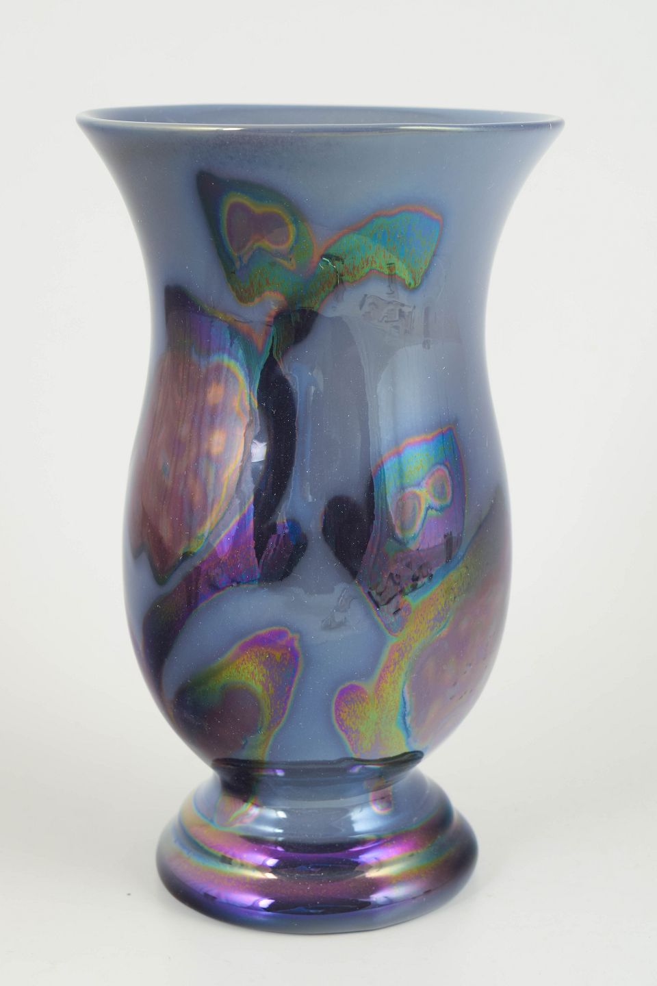 Decorative ceramic vase with a glossy lustre glaze and abstract, iridescent colour effects in blue, violet and green tones.