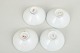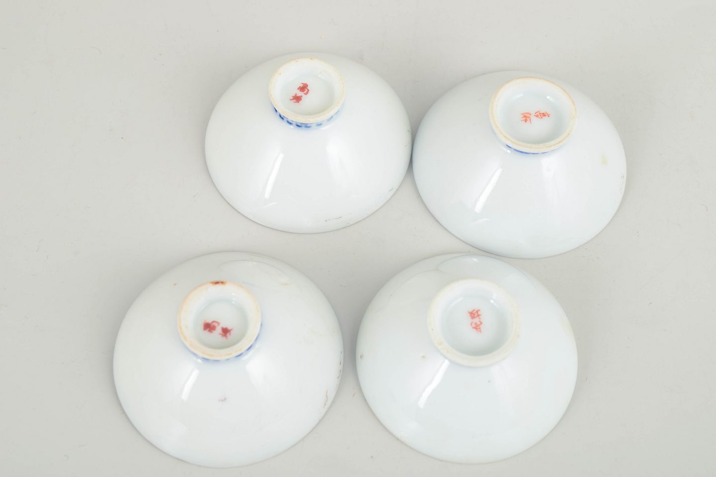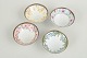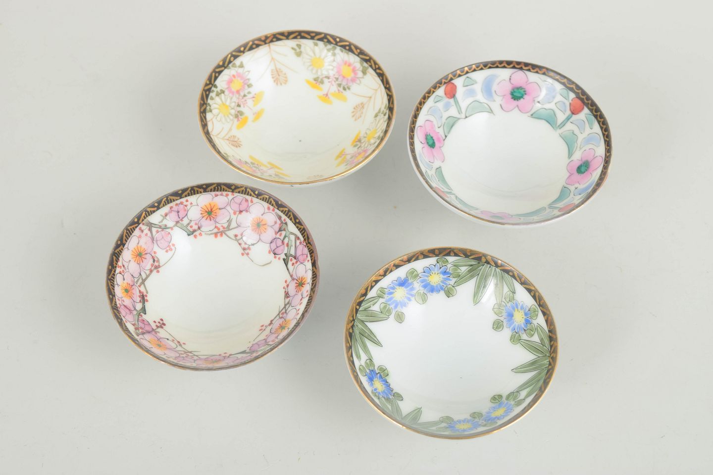 Set of four small porcelain bowls, each with hand-painted decoration in varied motifs and colours, including floral and stylised ornament. The bases show underglaze-blue and red marks.