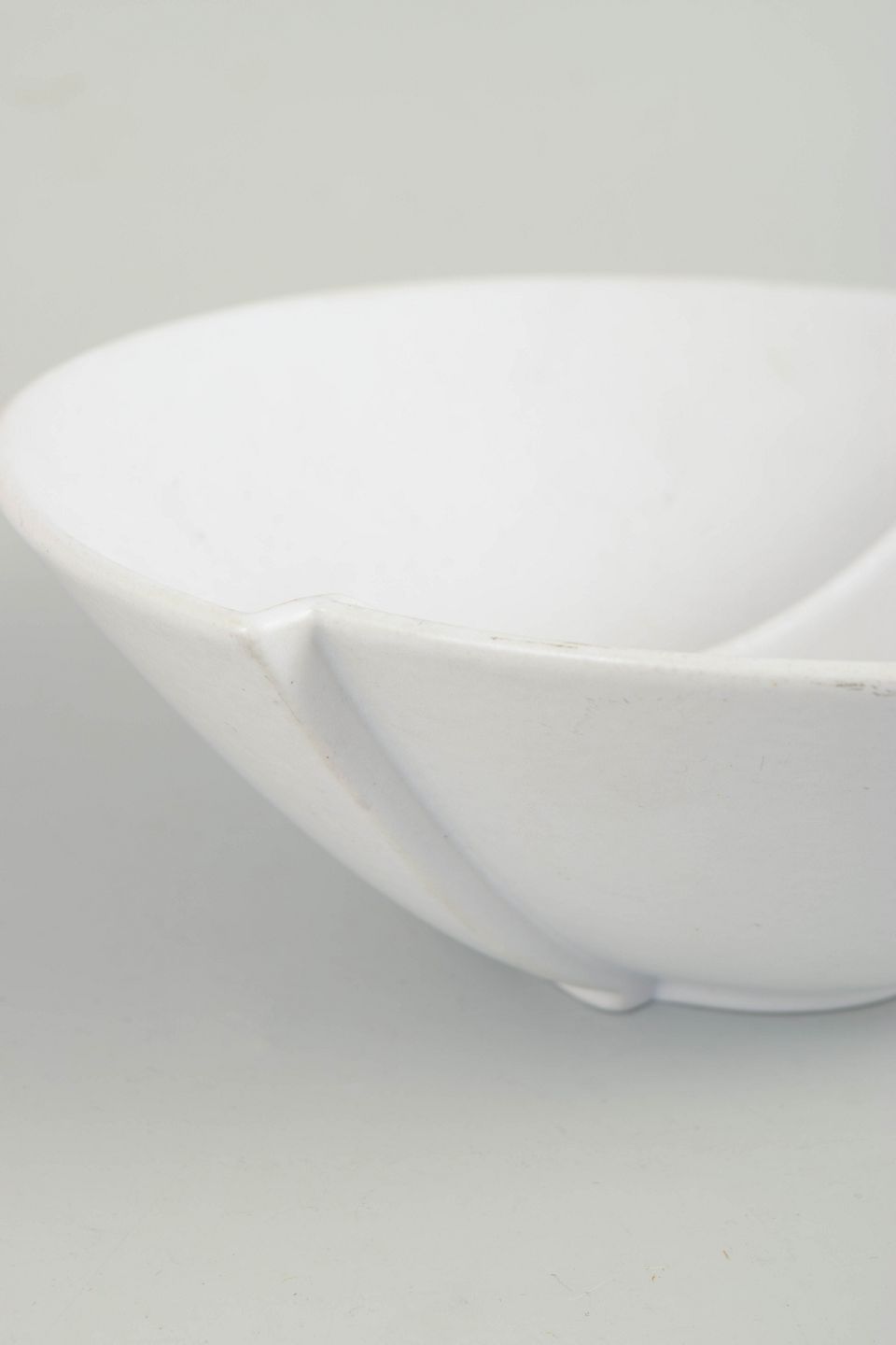Sculpturally shaped bowl in white-glazed faience with a softly curved, divided form characteristic of the Surrea series. The model is known for its organic, almost surreal expression, where function is combined with a strong artistic design. Executed without surface decoration, focusing on the lines and volume of the form.