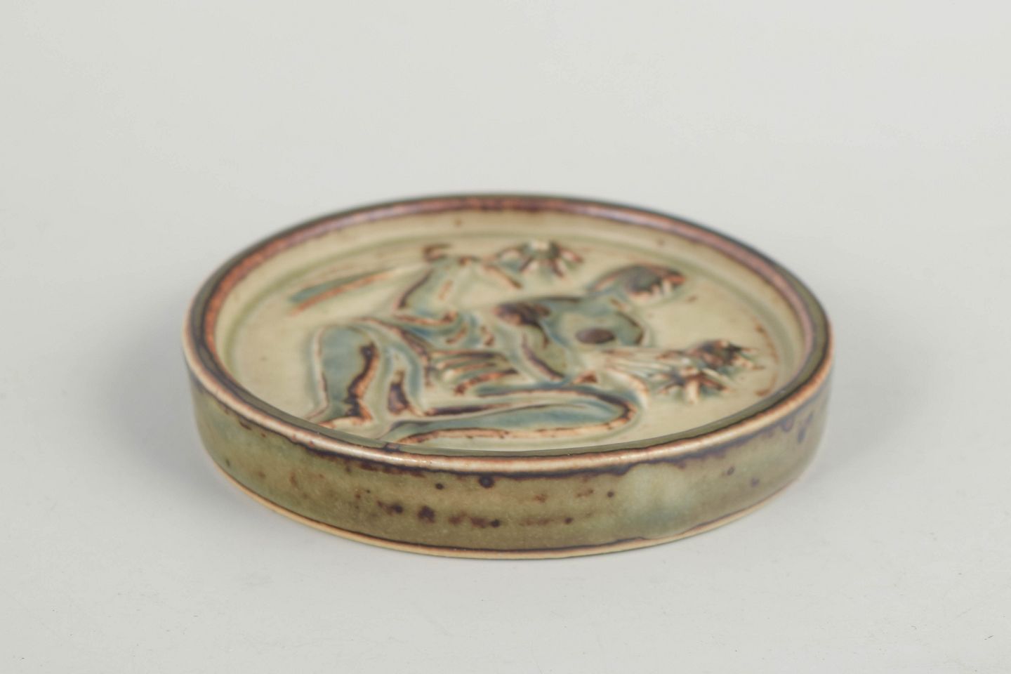 Relief-decorated miniature ceramic dish with figural motif, executed after model 21175.
