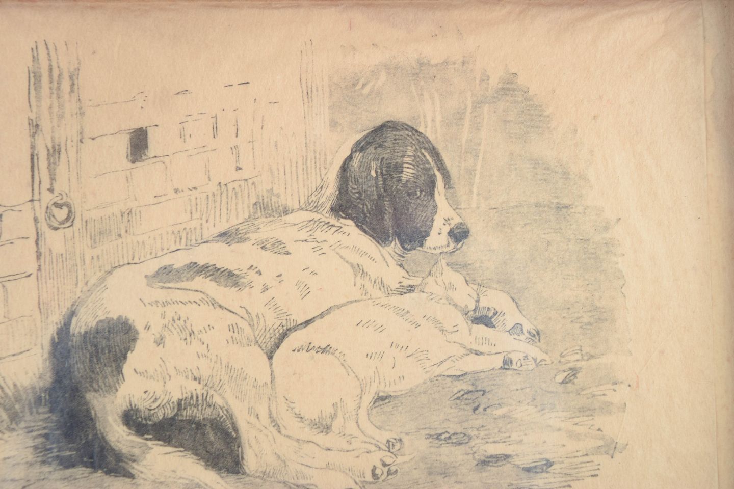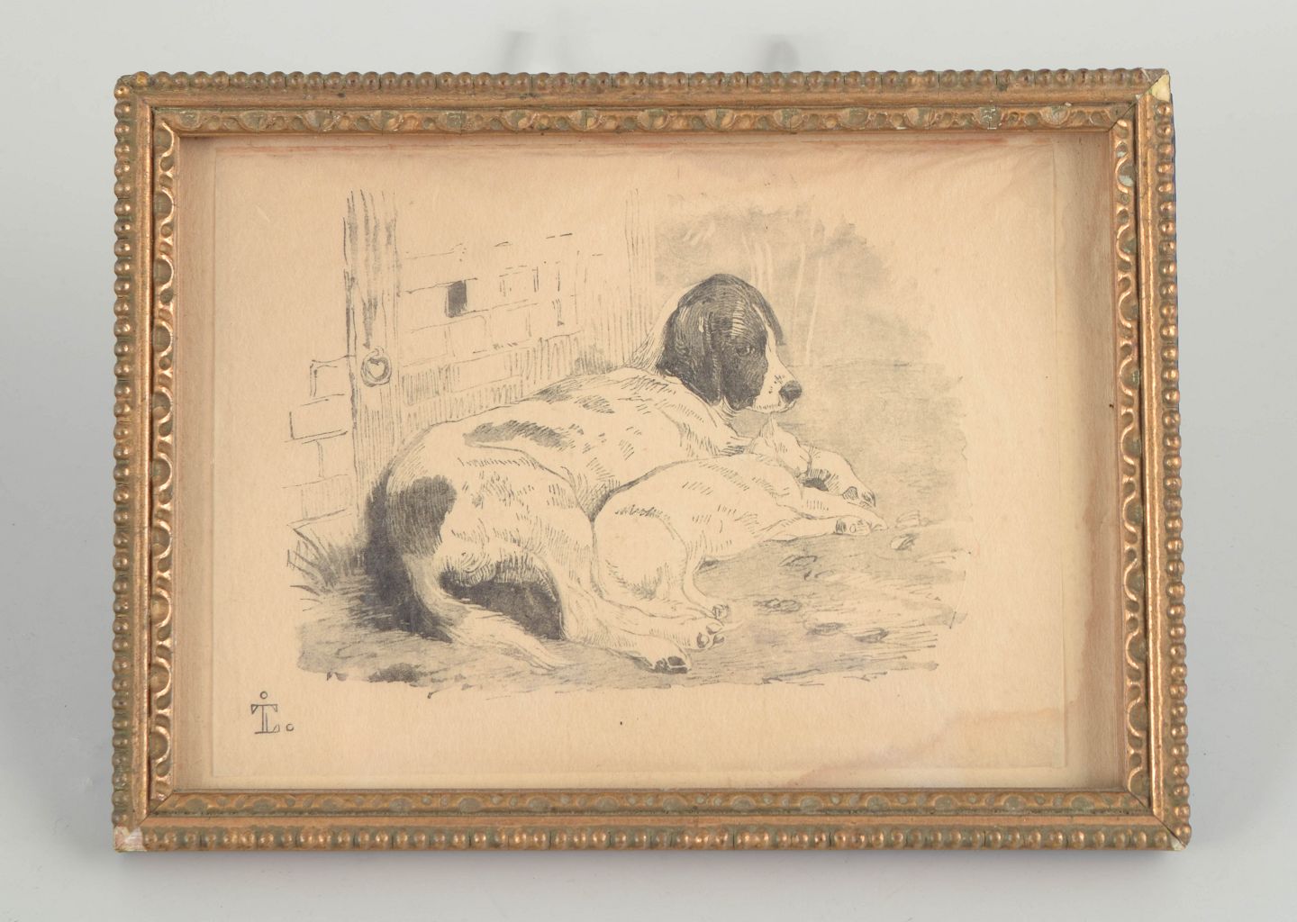 Naturalistic study of a resting dog executed as an etching with delicate line work and restrained tonal values, monogrammed in the plate.