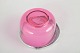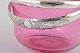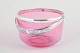 Round bowl in pink glass with an applied silver-plated metal handle, made in a simple functional form with lightly transparent glass.