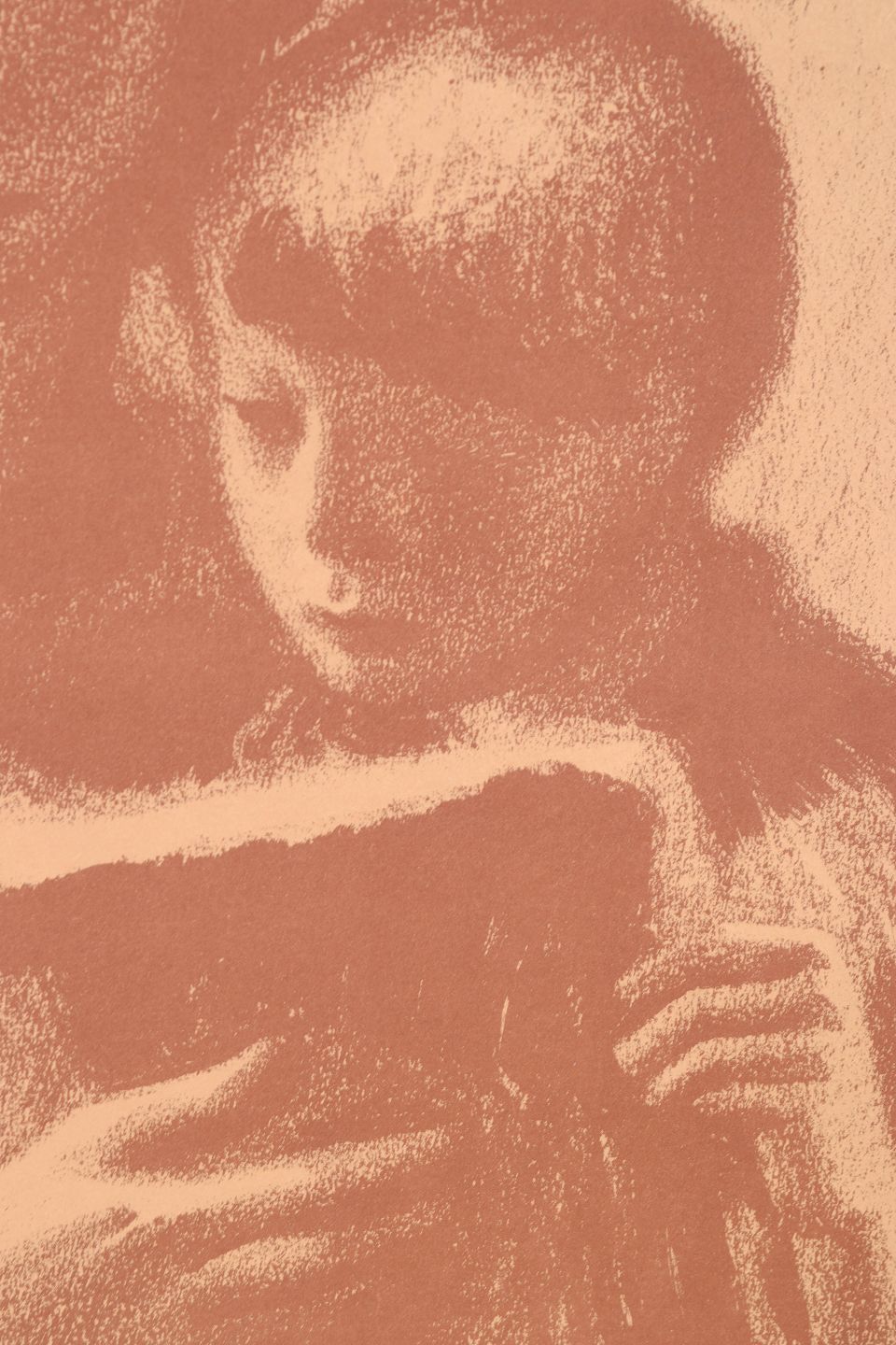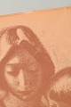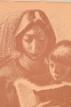 Figurative composition depicting a mother and child, executed in a soft and atmospheric graphic style with a strong social and humanistic focus. Signed and dated 1949.