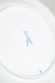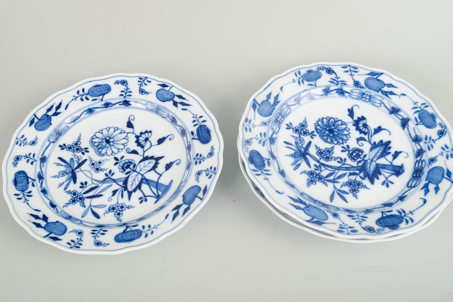 Dinner plates in white porcelain decorated with the underglaze blue Blue Onion pattern and a scalloped rim. Marked to the base with the Meissen crossed swords.