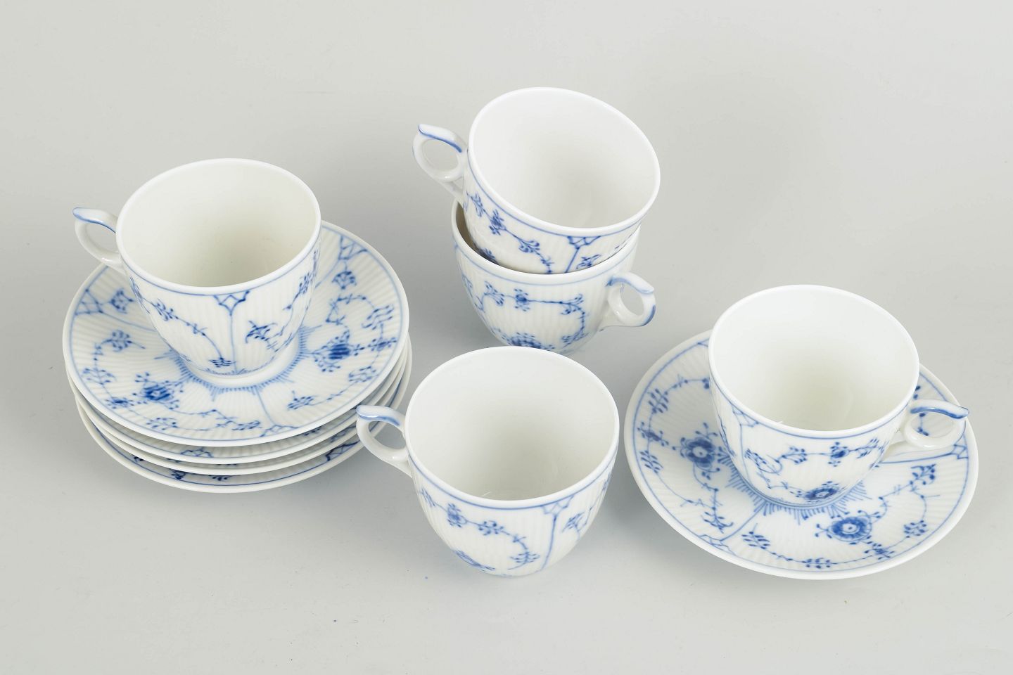 Royal Copenhagen, Blue Fluted Plain coffee cups with saucers, set of 5 pairs.