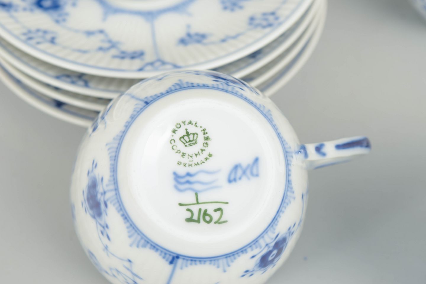 Blue Fluted Plain is Royal Copenhagen’s oldest pattern, first introduced in 1775. During the 1960s, the pattern remained a cornerstone of Danish porcelain production, valued for its continuity, craftsmanship, and everyday usability. Coffee cups from this period illustrate how traditional hand-painted decoration was maintained within a modern post-war context.