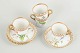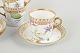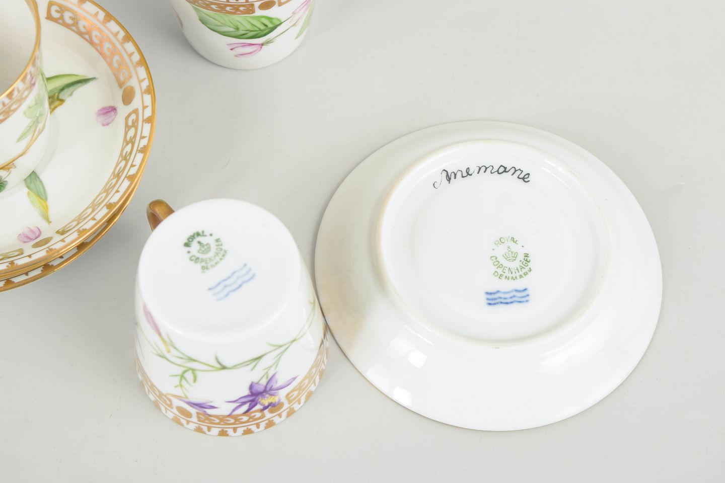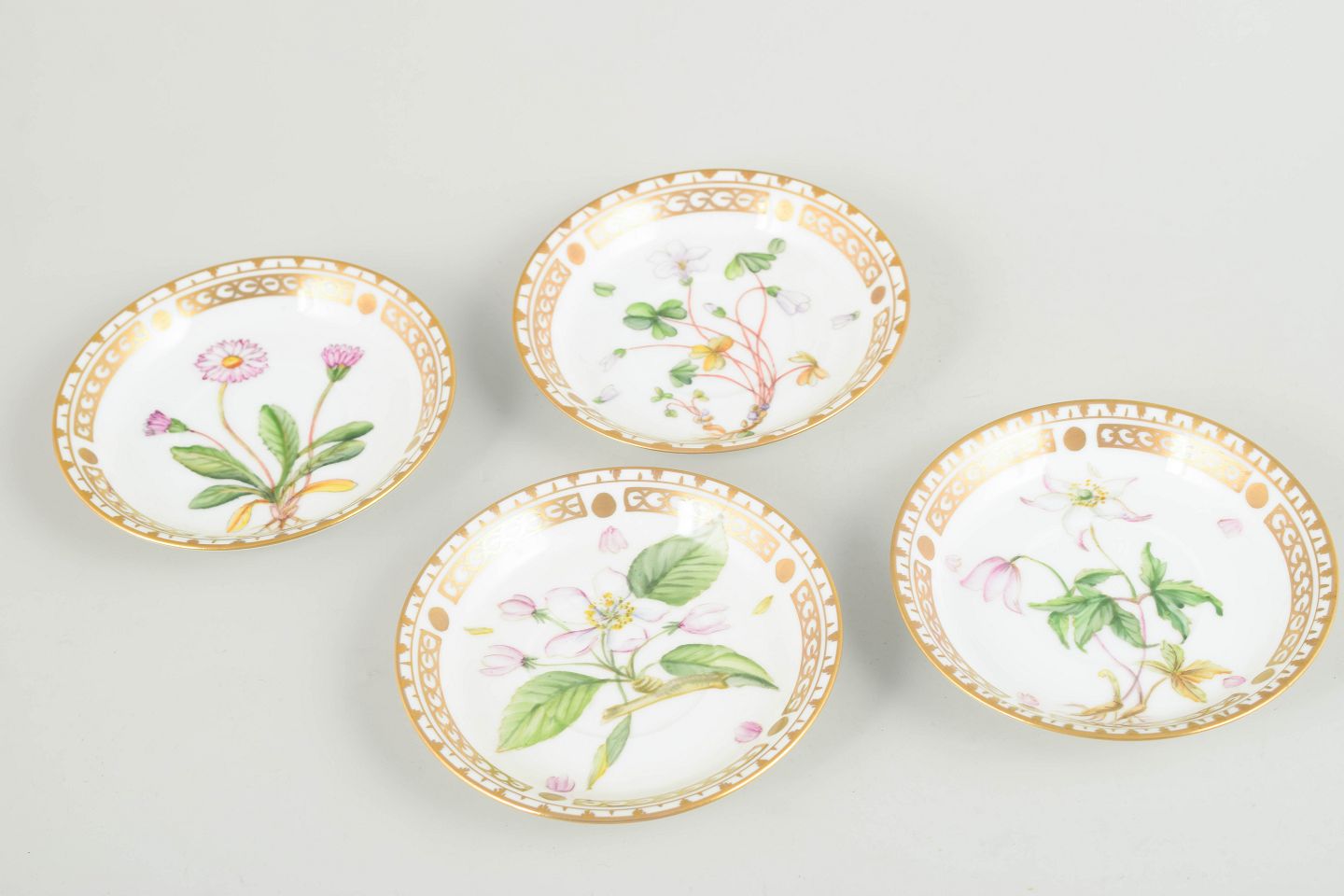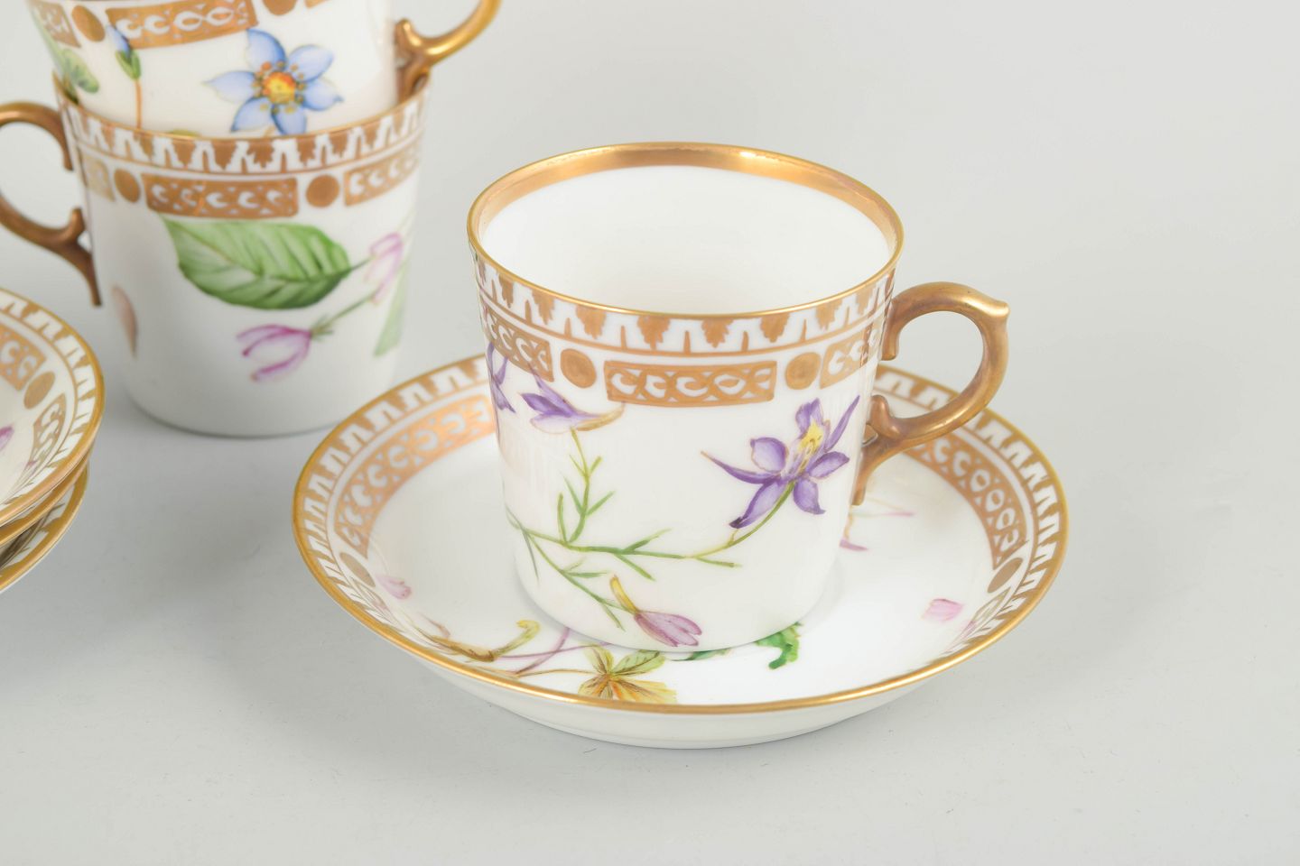 Porcelain in Flora Danica style with hand-painted botanical motifs and gilt rims.
