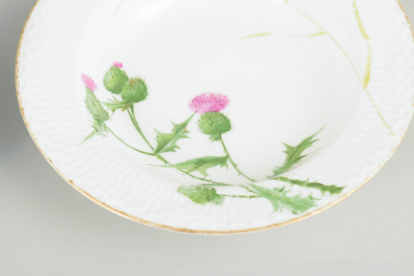 Hand-painted deep porcelain plates decorated with a naturalistic thistle motif and a gilded rim. The plates feature a subtly ribbed surface and display the high level of craftsmanship characteristic of Royal Copenhagen’s production in the second half of the 19th century.