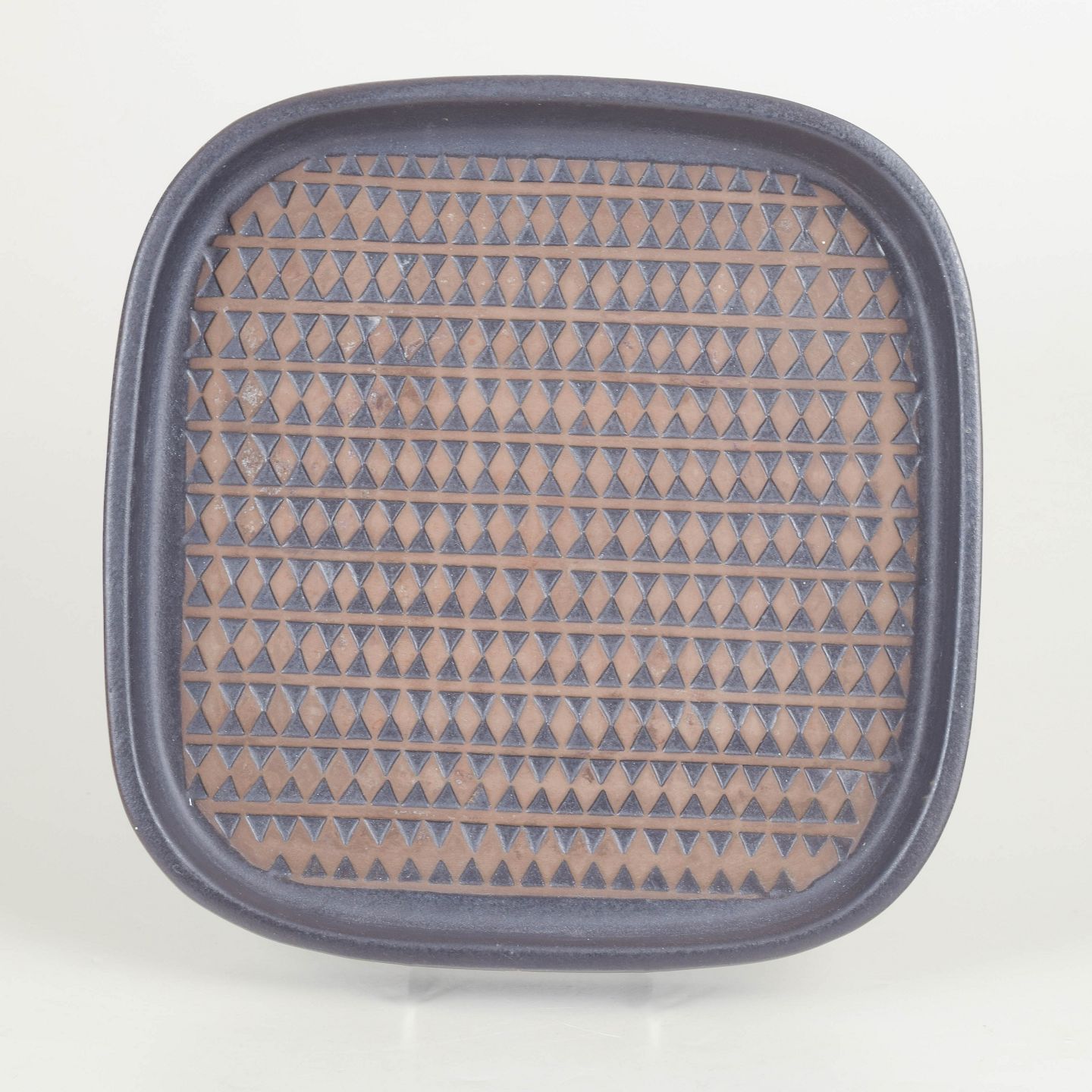 Large square stoneware dish with rounded corners and a decorative surface featuring a repeating triangular pattern in brown and blue glaze. Slight relief with a distinctive graphic expression. With original sticker. Model 4095M.