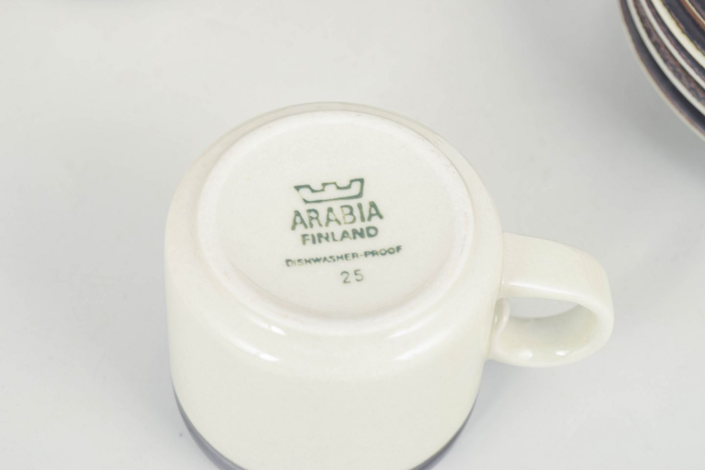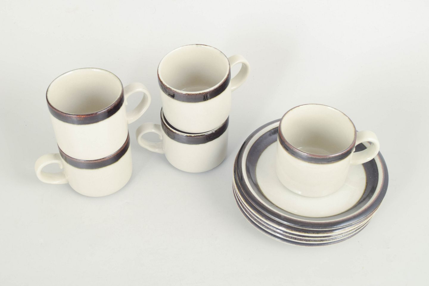 Rustic stoneware service with characteristic brown band decoration on a light ground. Karelia model.