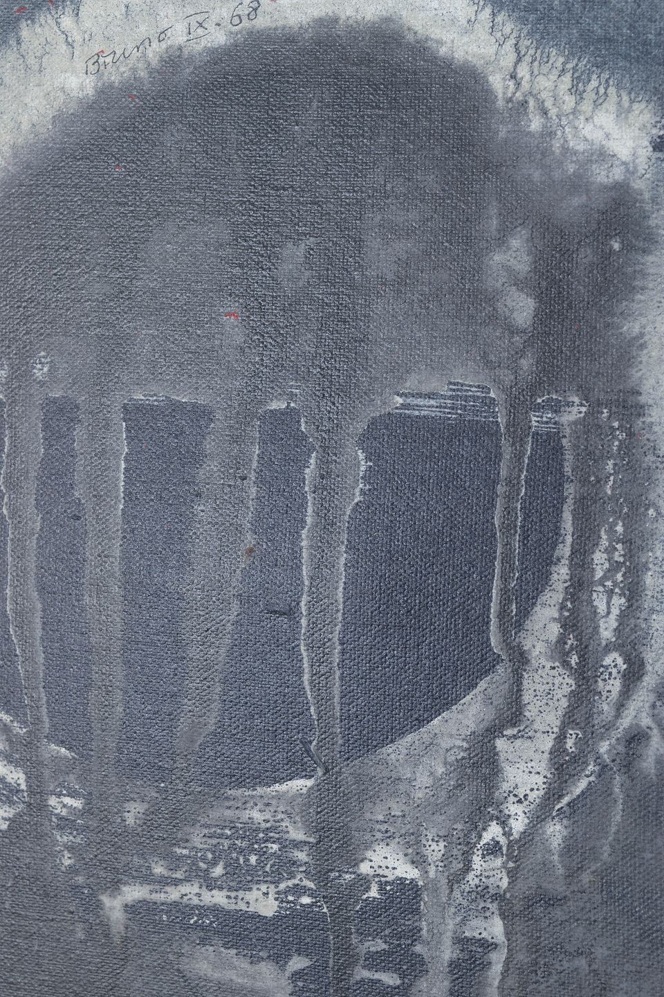Abstract composition with circular motif and dripping, textured layers executed in oil on canvas, signed Bruno 68.