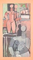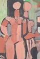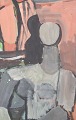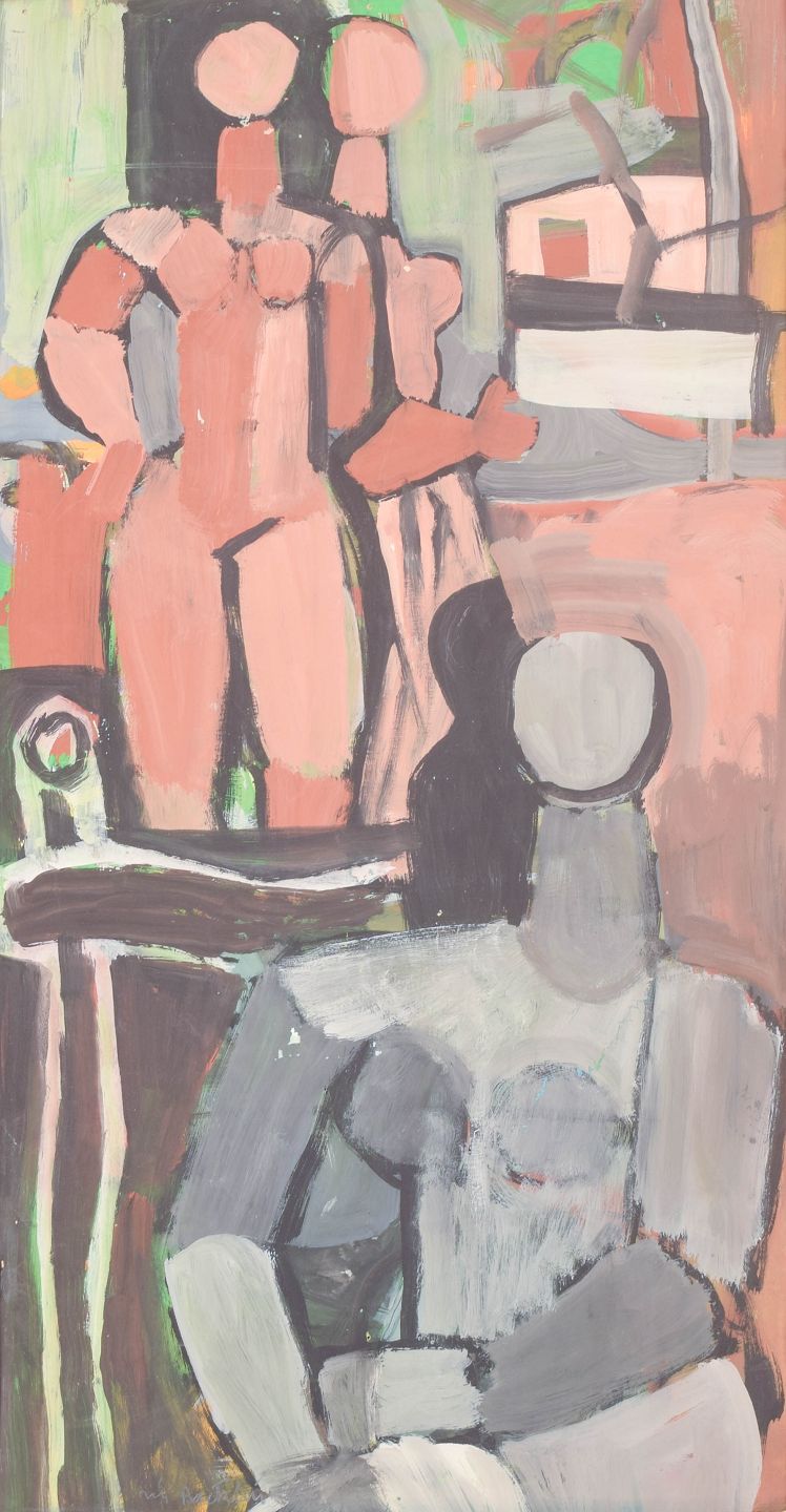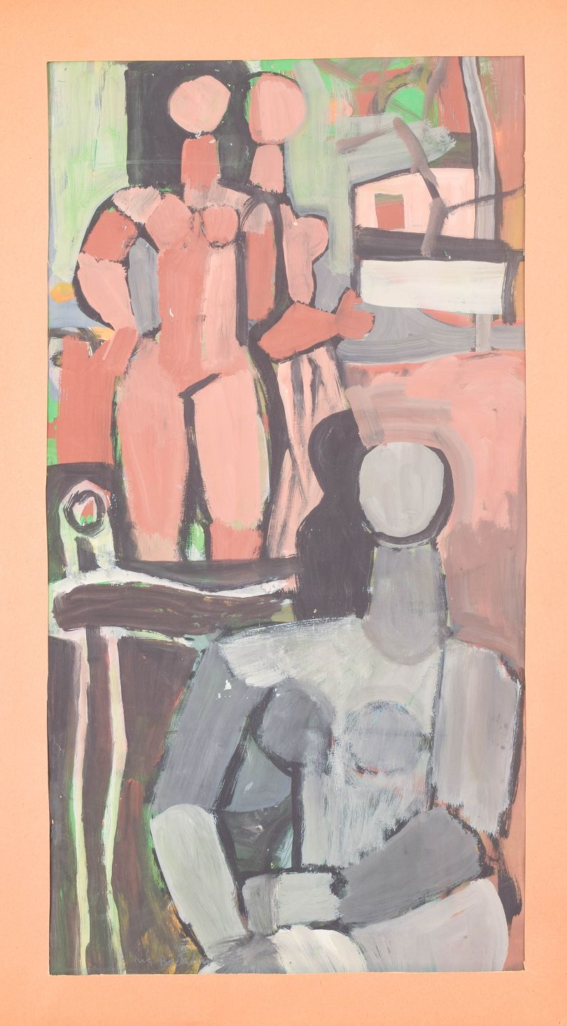 Modernist figurative composition featuring abstracted human figures and interior elements, executed in an expressive colour palette in oil on paper.