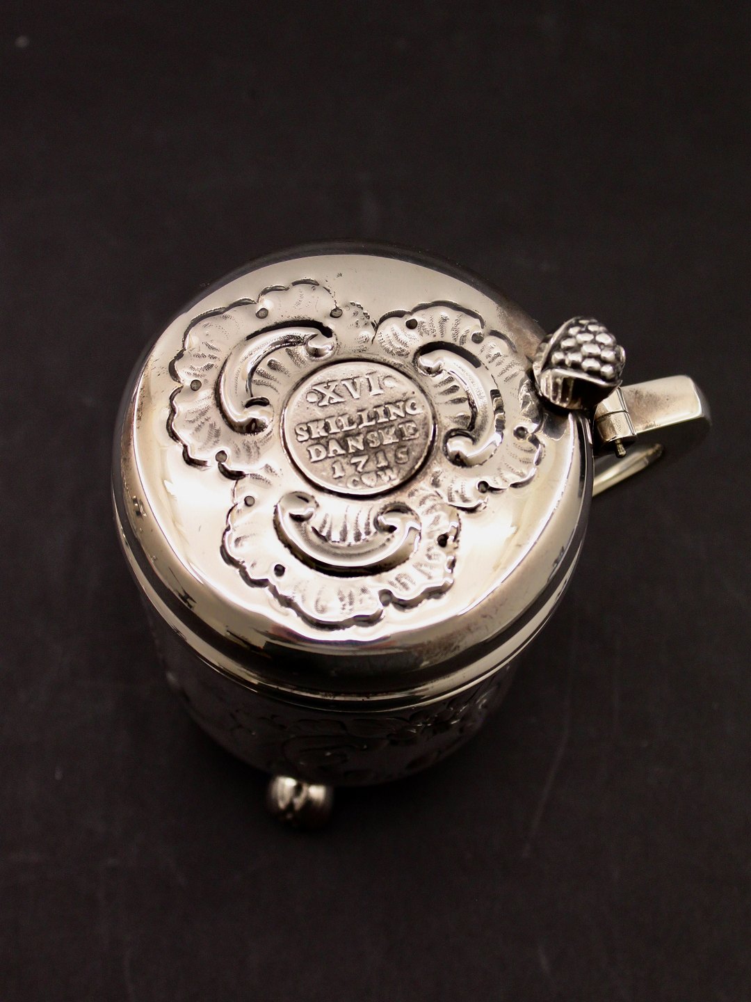 Silver mug with old silver schilling coin H. 13 cm. item no. 623826