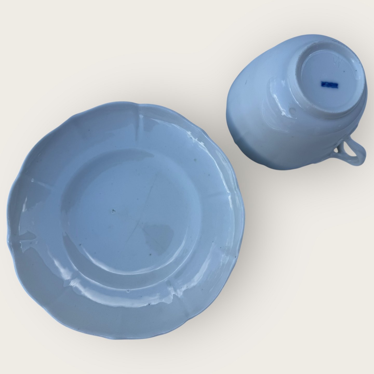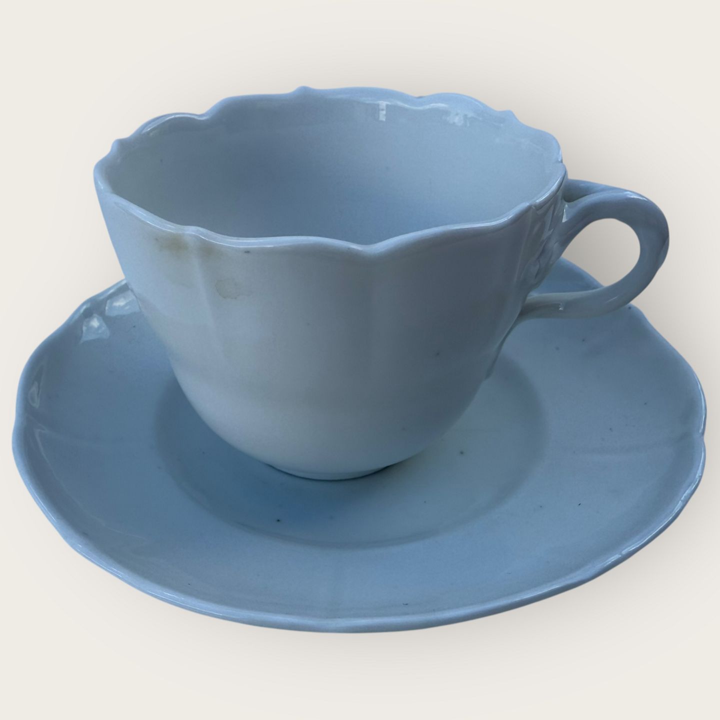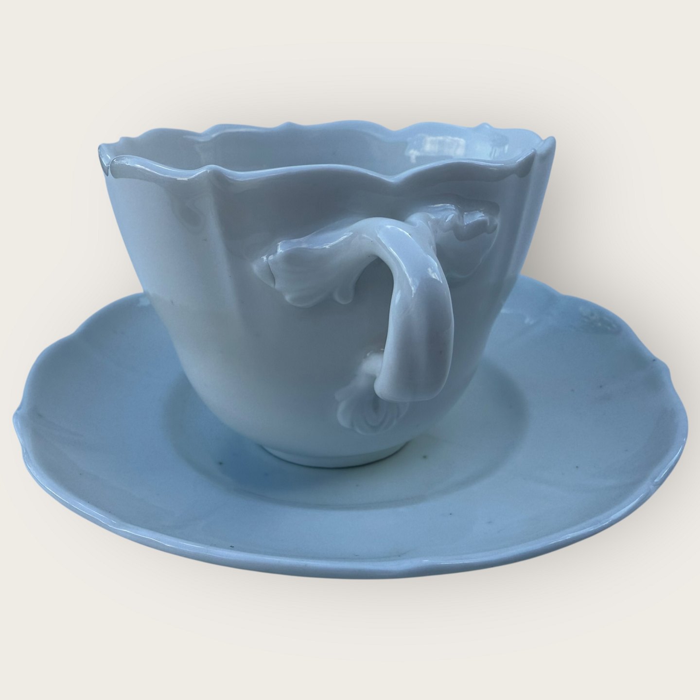 Royal Copenhagen, White large cup, Antique, 8.5 cm high and 10 cm in diameter, cup in good condition, but saucer with small star/crack (see photo).