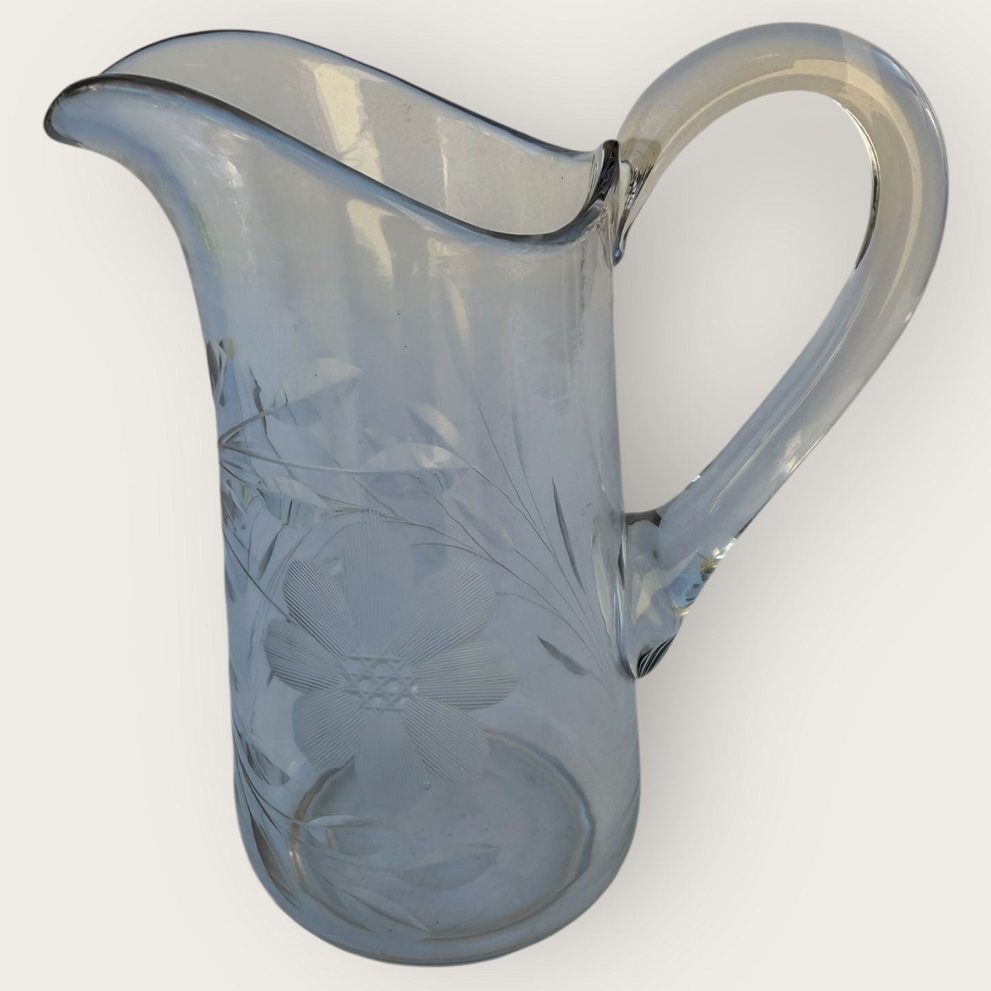 Glass jug, with flower cuts, 17cm high, 14x9cm wide, *Good condition*