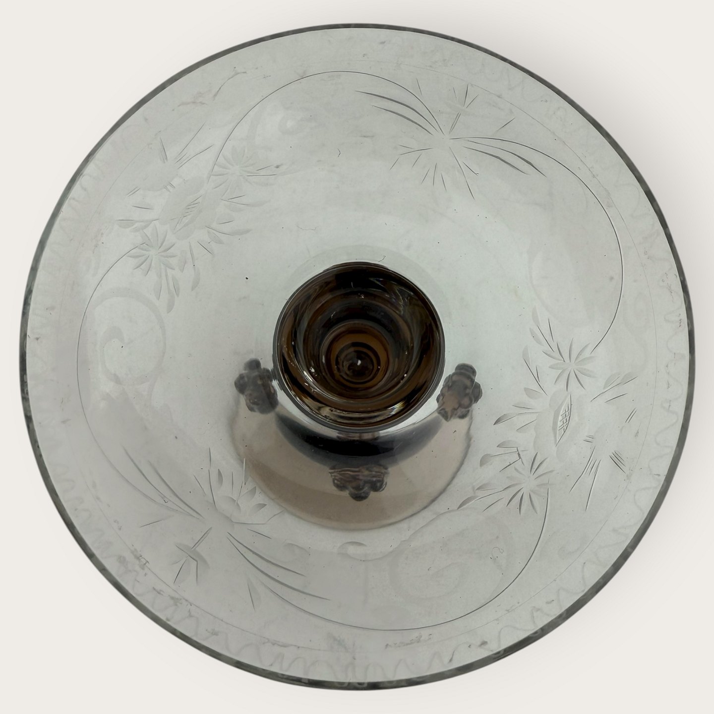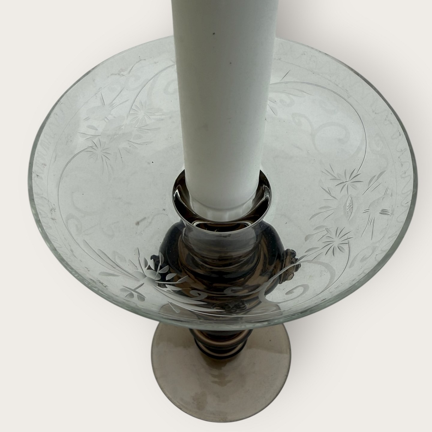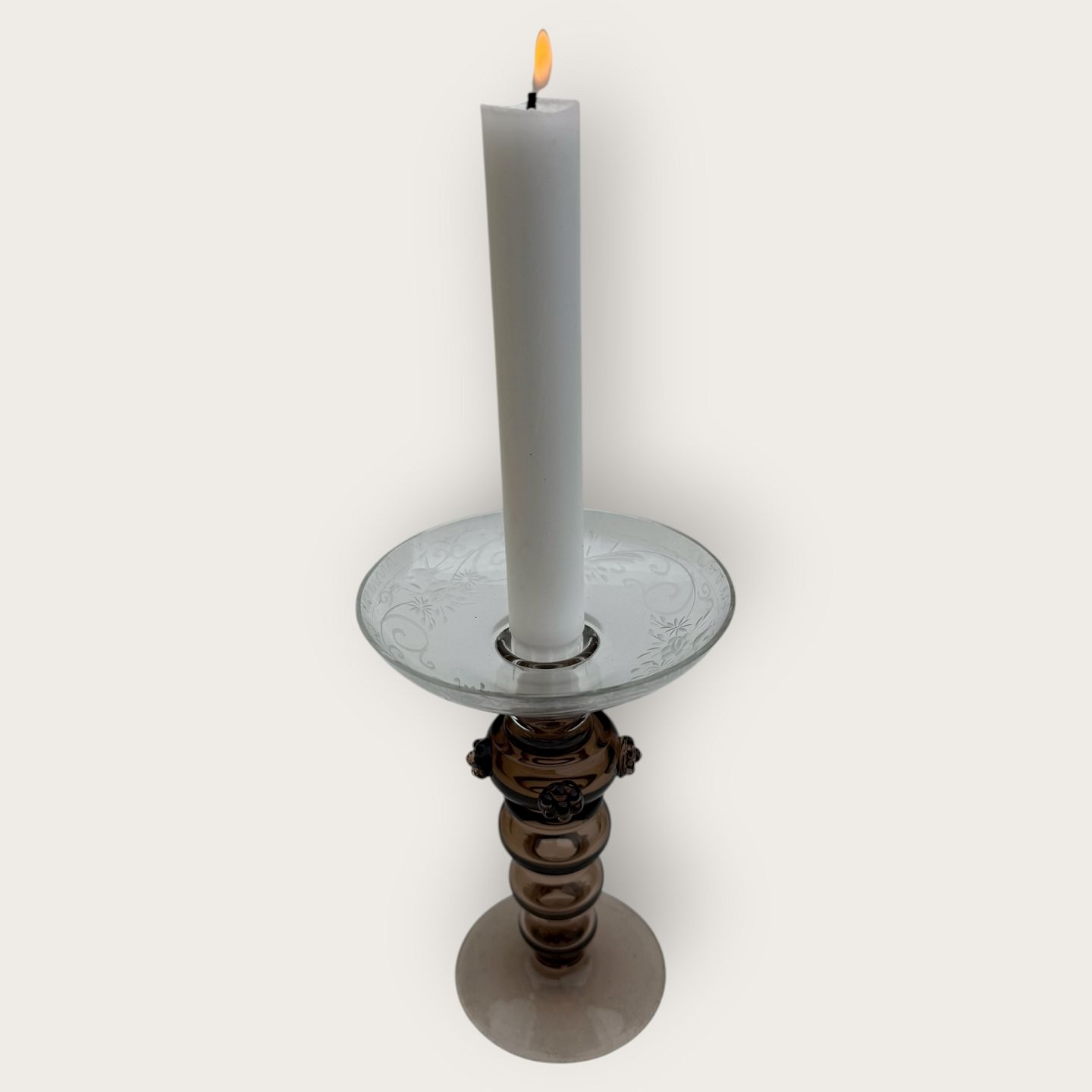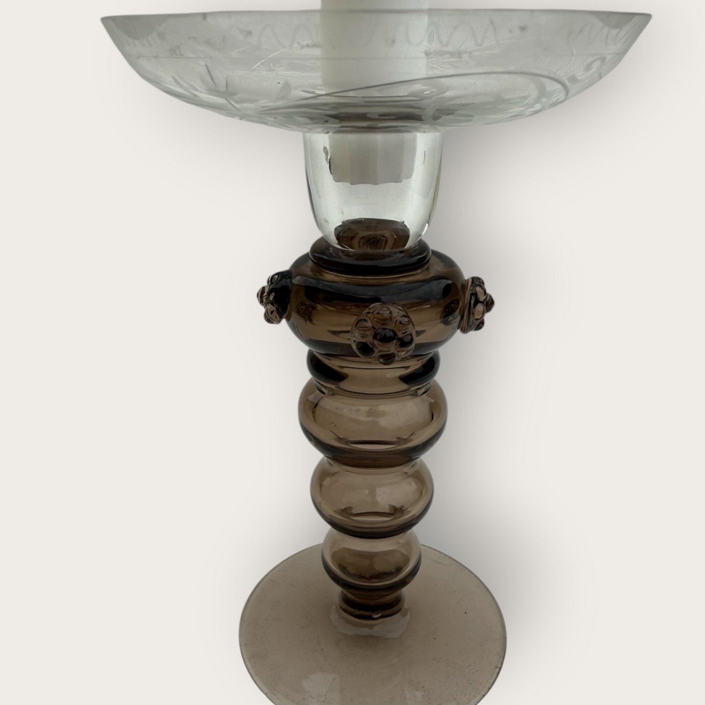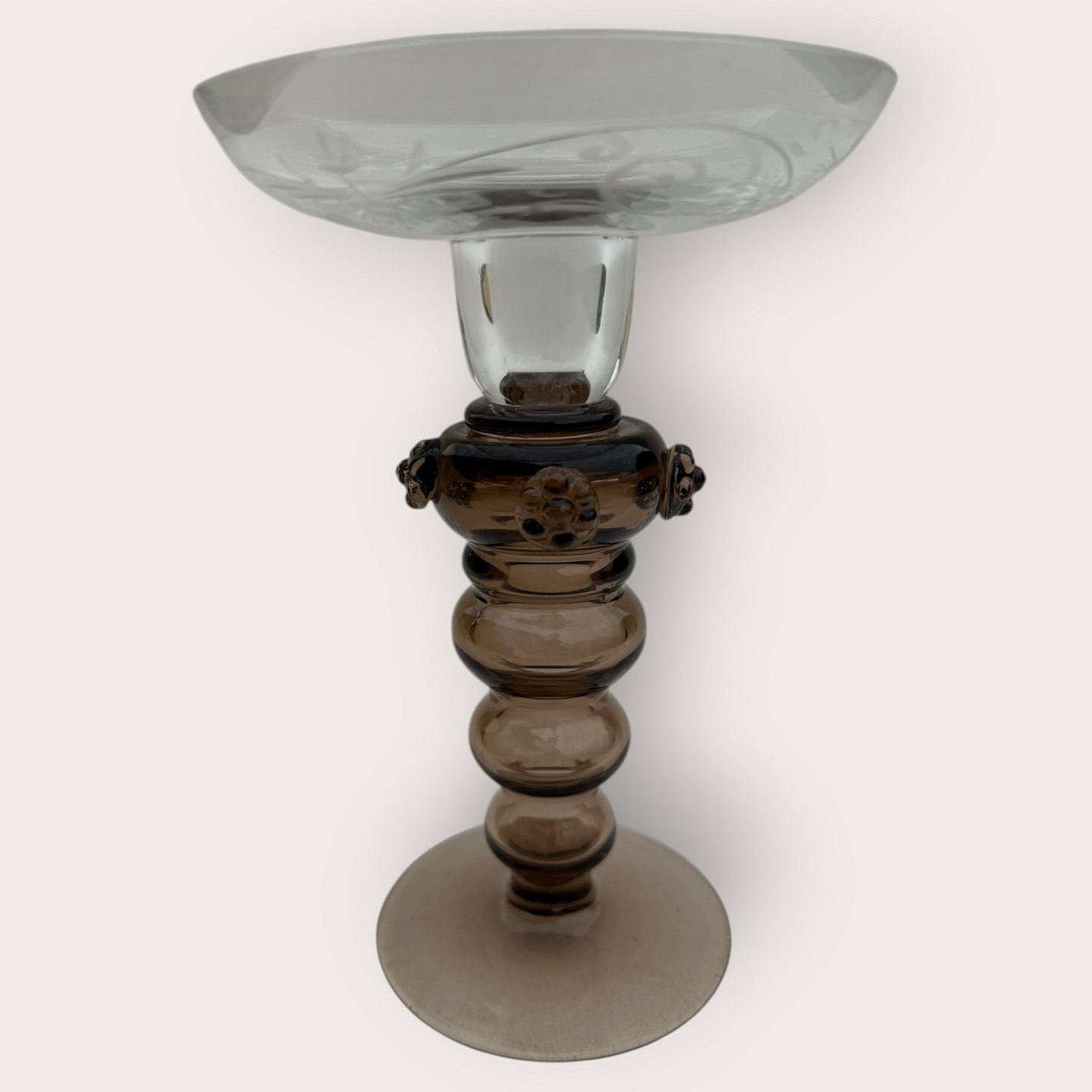 Old glass candlestick, hollow brown stem with rosettes, bowl with cuts of birds, patterns and flowers, nice condition, height 16.5cm, diameter 11cm