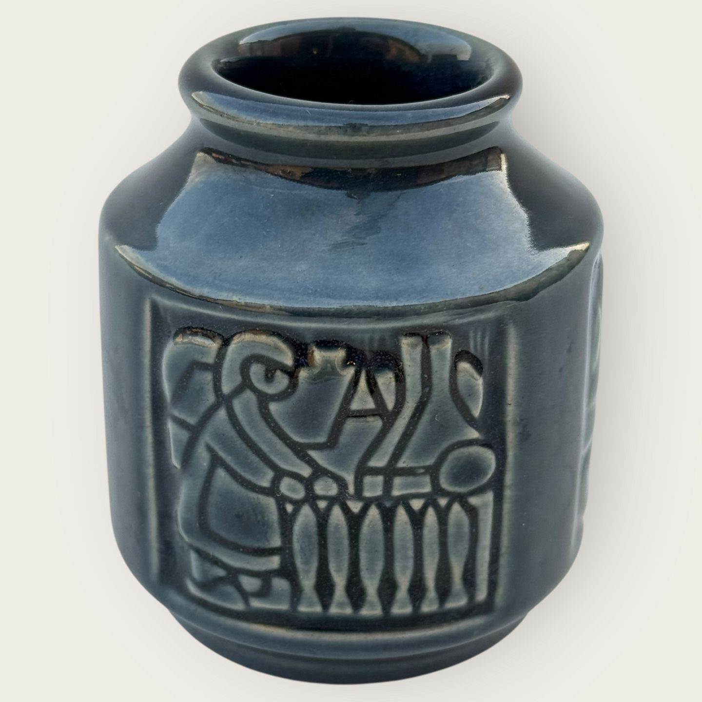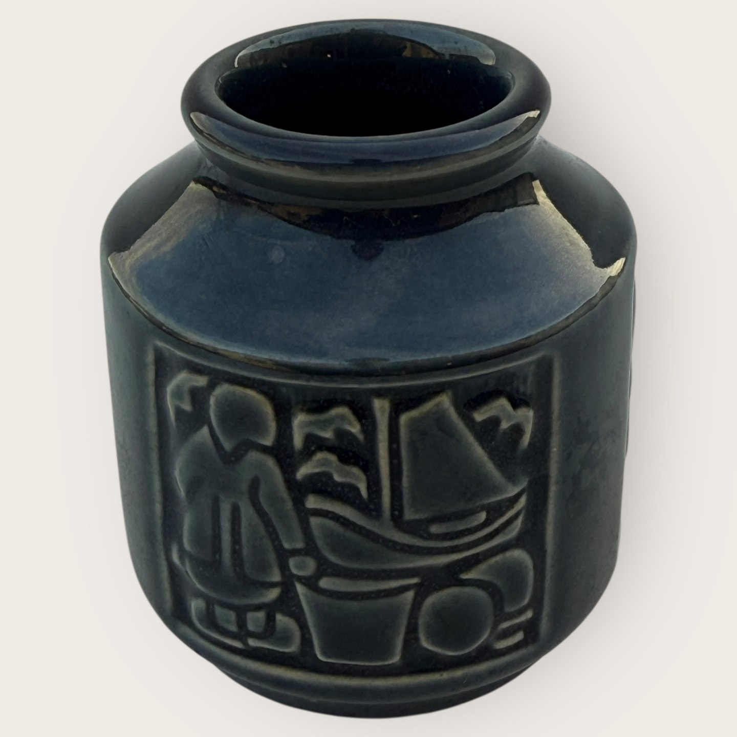 Bornholm ceramics, Michael Andersen, Small vase with motifs from Bornholm, smokehouses, fishermen's wives, etc. Height 8cm, diameter 6.5cm, #6123, fine condition.