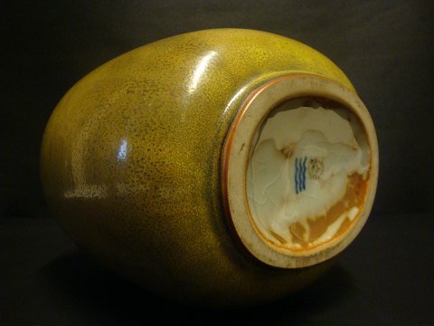 SolgtKgl. Oval Stentøjsvase i solfatara glasur af Nils Thorsson. Højde 18,5cm og 17cm bred.I meget fin stand.