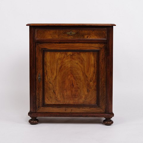 Detaljerne i intarsia arbejdet tilføjer et unikt og dekorativt præg til møblet, der fremstår som et tidløst og raffineret stykke fra perioden. Skabet er perfekt til opbevaring og vil tilføje en elegant antik charme til ethvert rum.