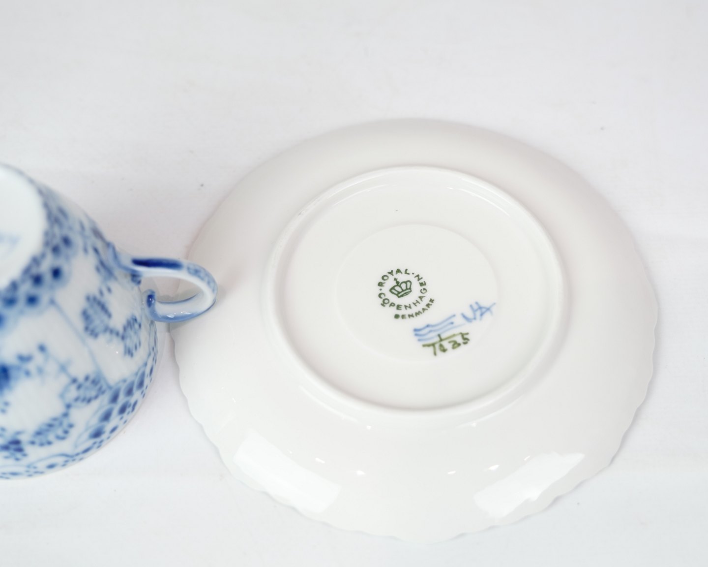 Kop og underkop af mønstret Helblonde musselmalet fremstillet af Royal Copenhagen med model nr. 1 / 1035. Helblonde stellet blev først præcenteret af Royal Copenhagen i 1886 med inspiration fra kinesisk stil.