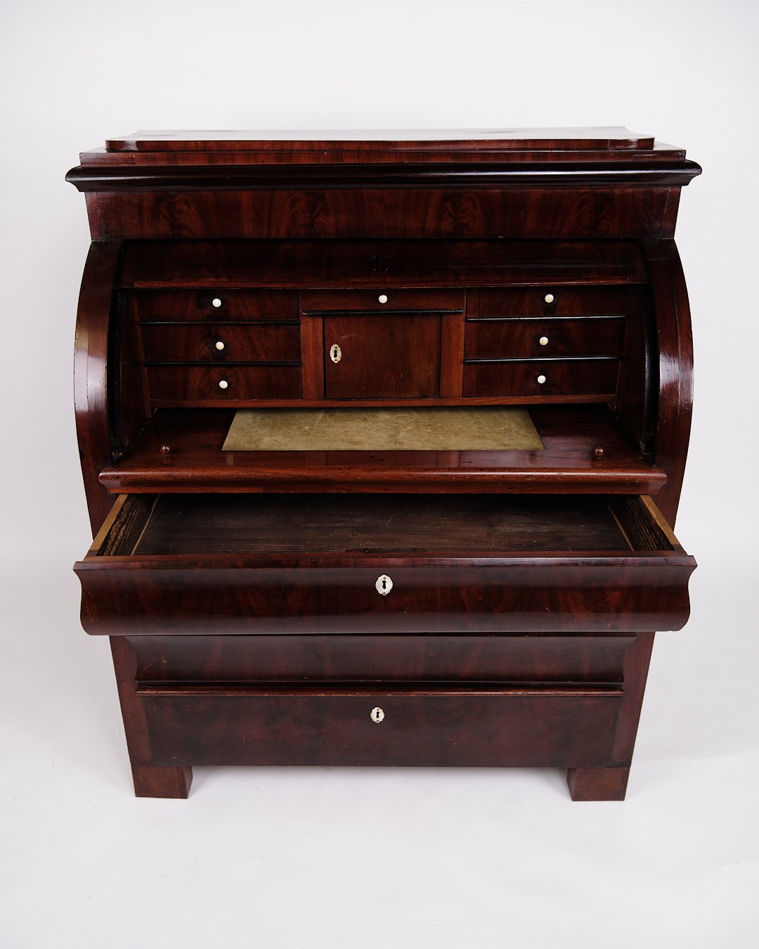— Material: Hand-polished mahogany with mother-of-pearl fittings and leg knobs