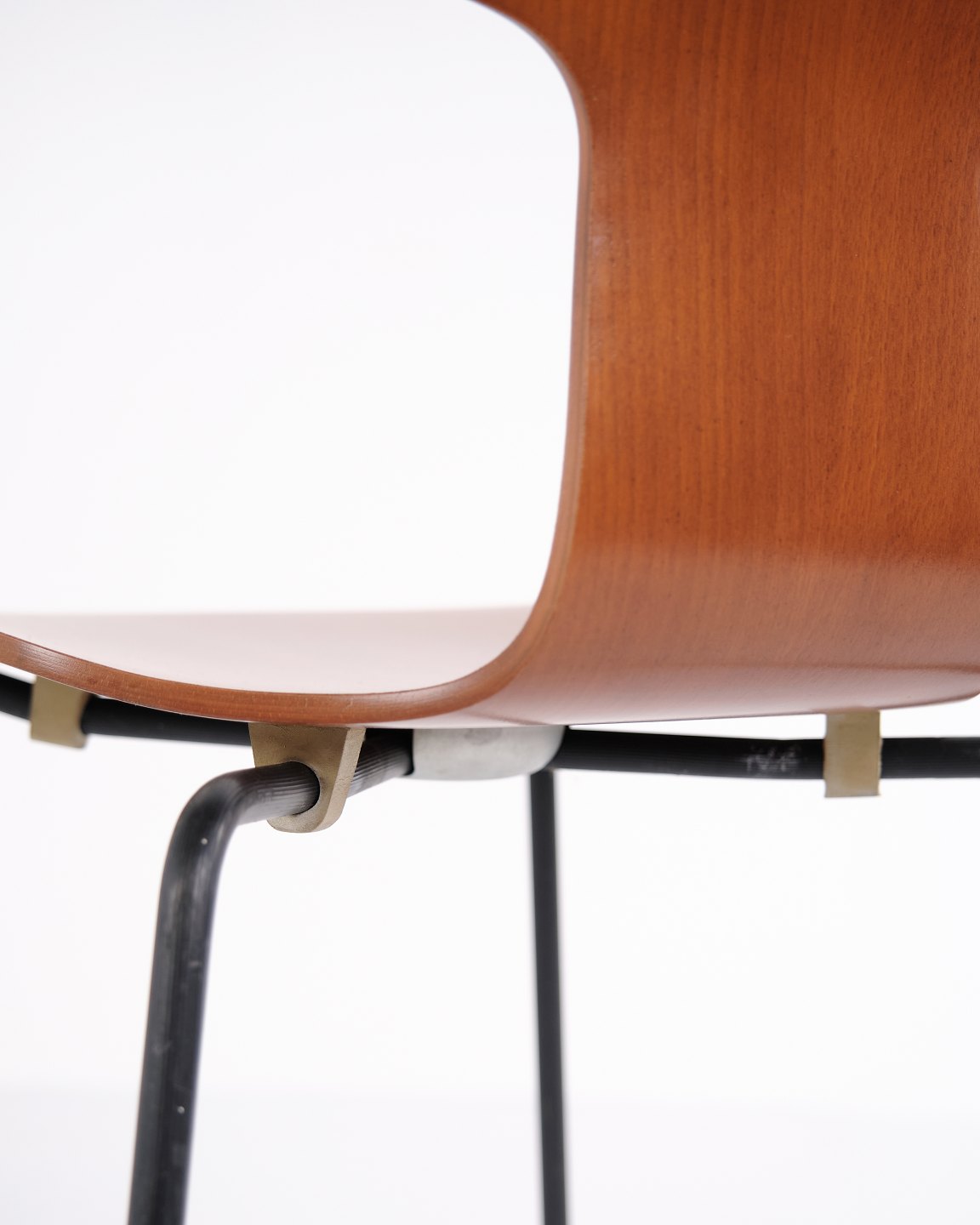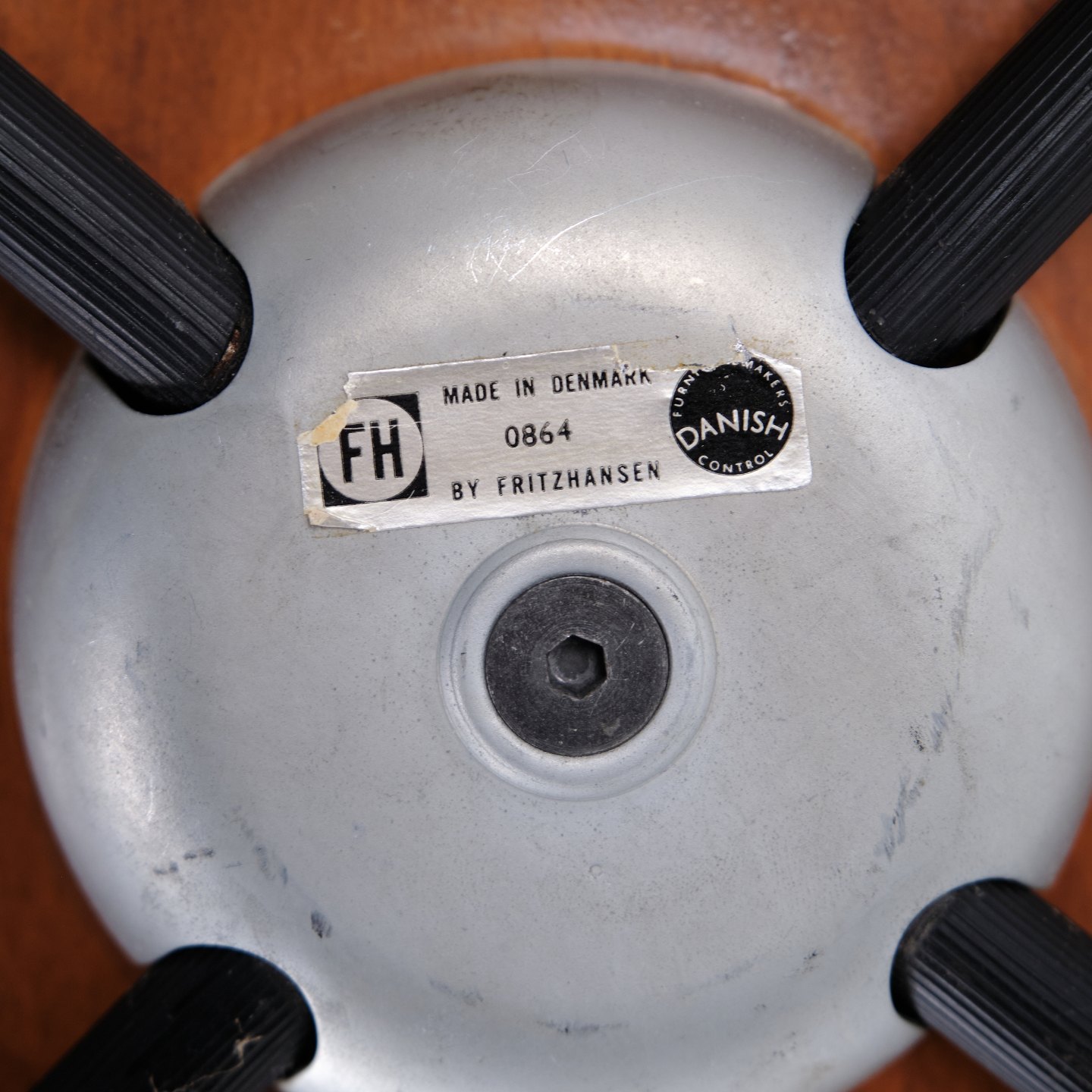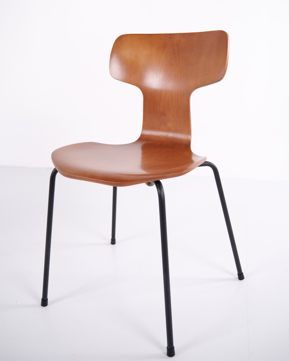 Sæt af seks spisestuestole, model 3103, også kaldet T-stolen eller Hammerstolen, fra Fritz Hansen. Stolene er professionelt behandlet og restaureret på vores værksted og fremstår i flot stand. Udstyret med originale Fritz Hansen- og Danish Control-labels, som dokumenterer ægthed og produktion.