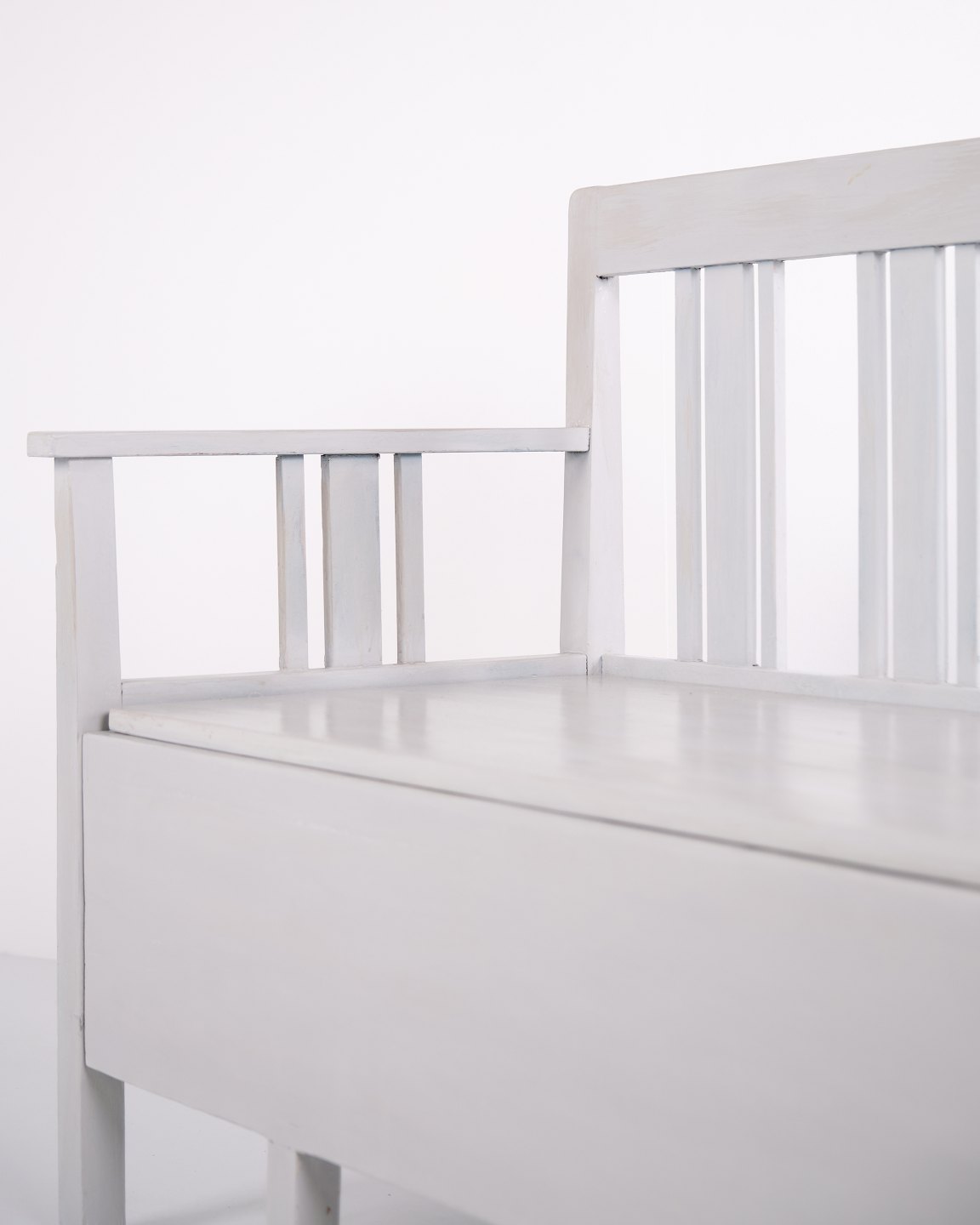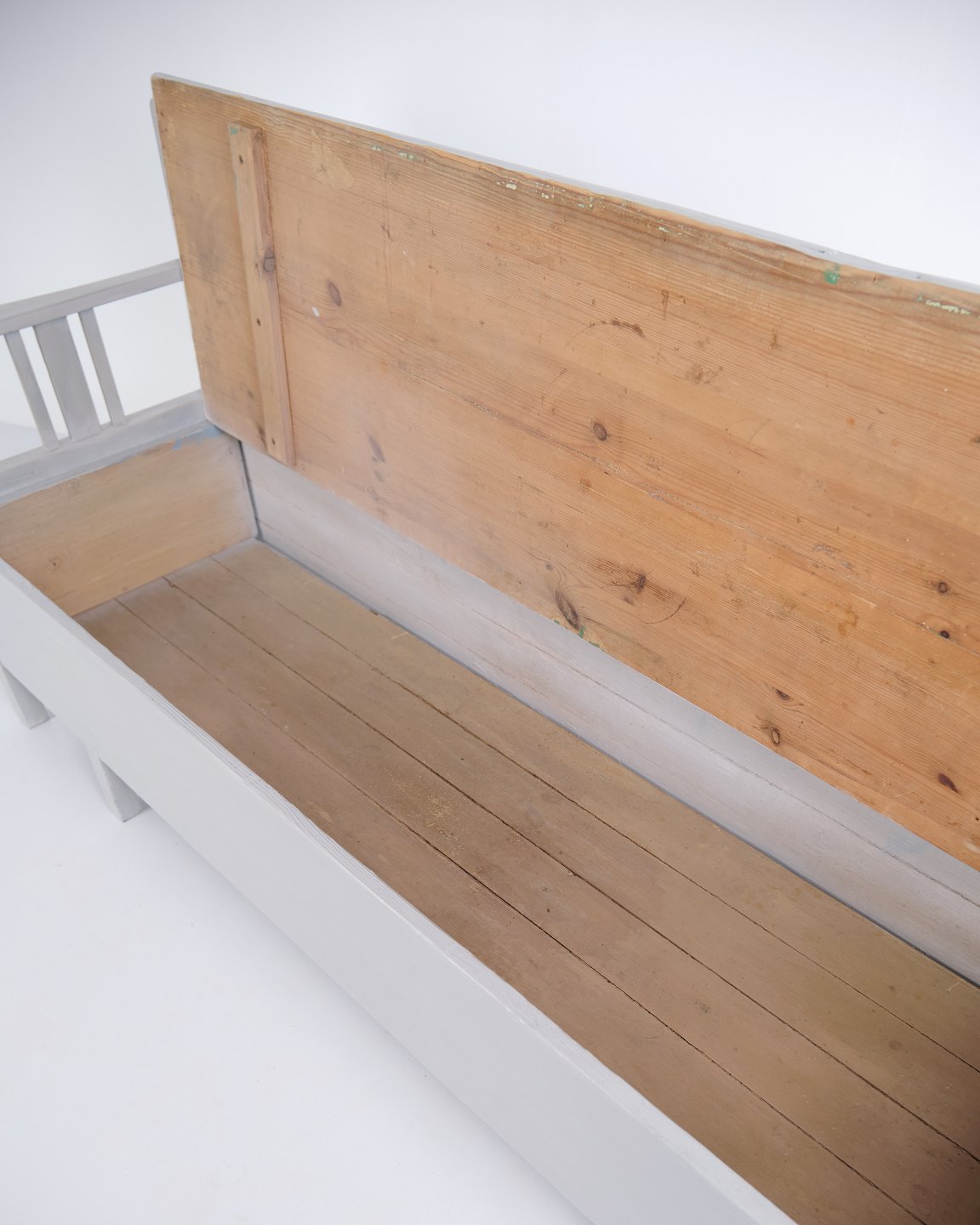 Swedish bench from the 1860s, made in pine and later painted in grey. A classic Scandinavian piece with decorative painted details and practical seating and storage function. Solid antique furniture with characteristic period features.