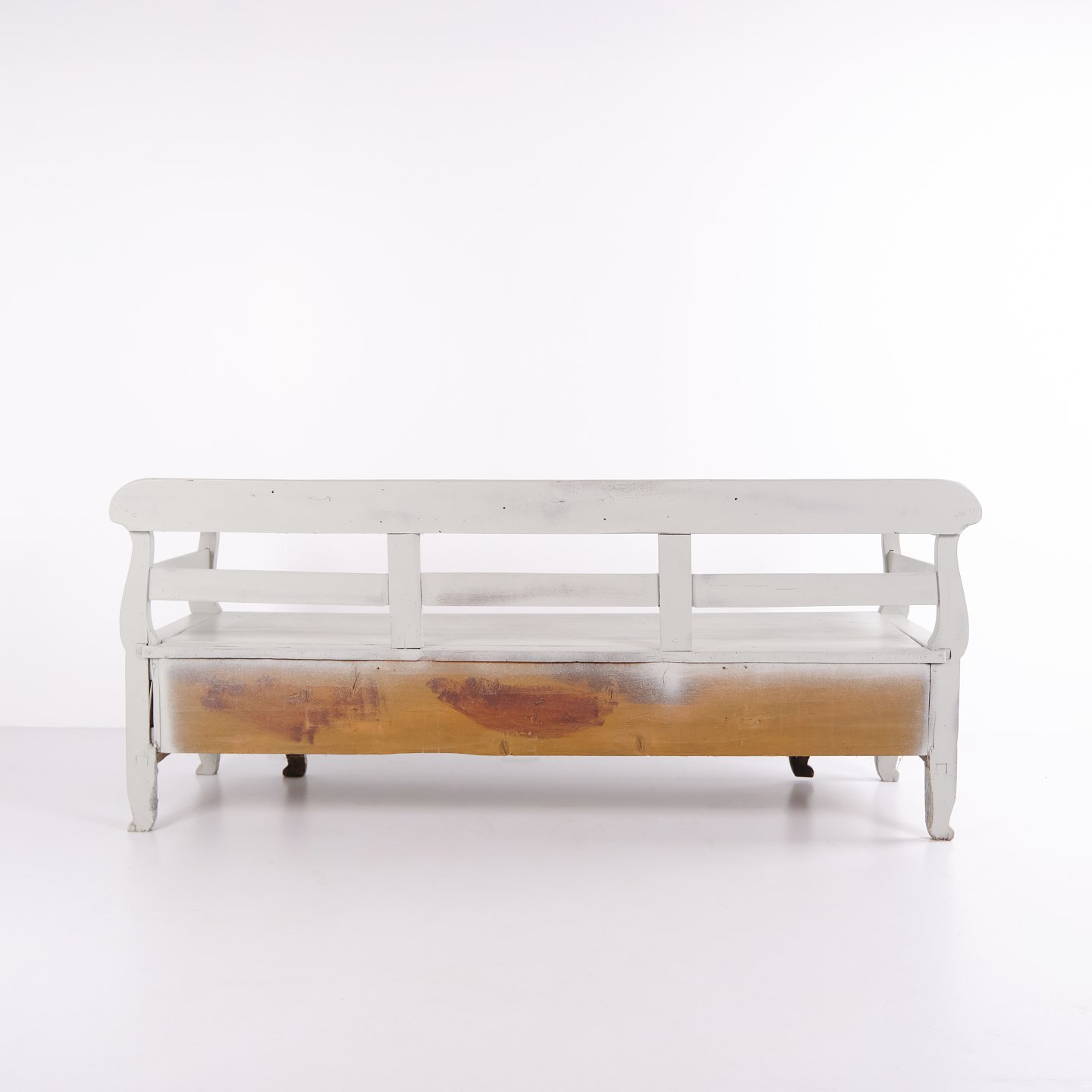 Antique storage bench from the 1860s in grey painted pine wood with integrated storage. Classic and functional furniture piece with patina.