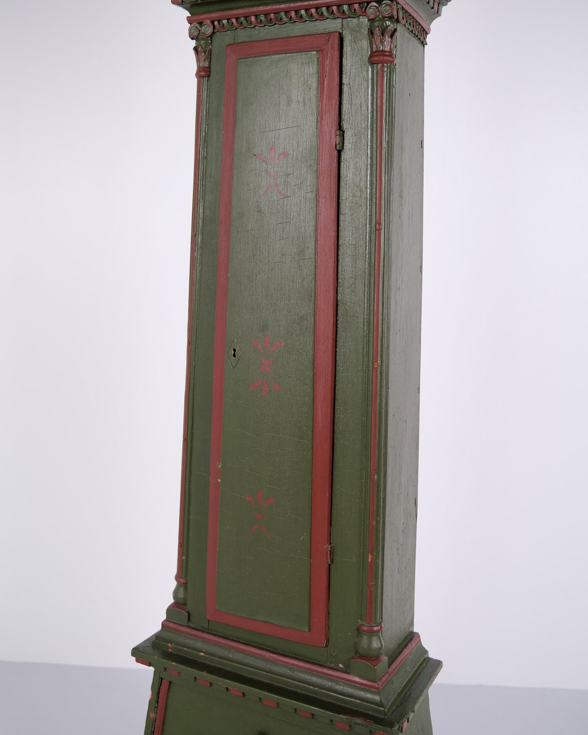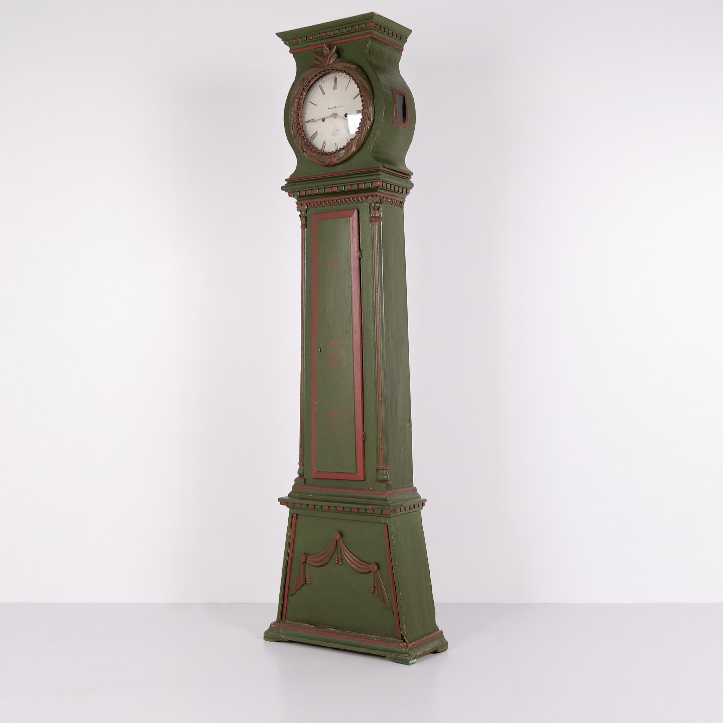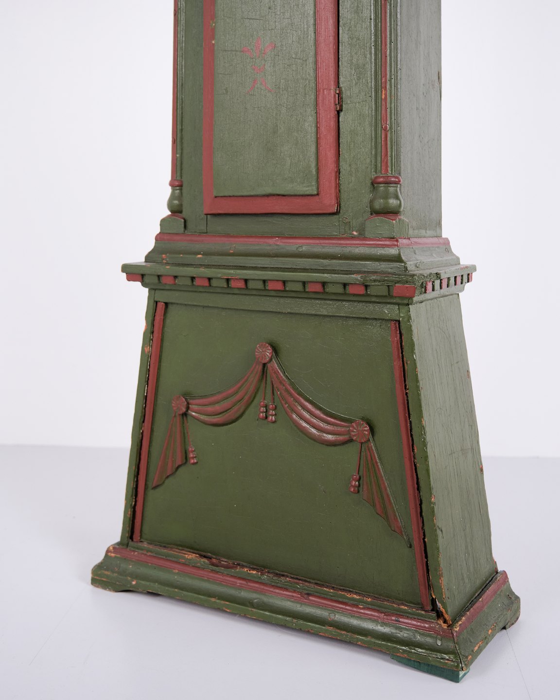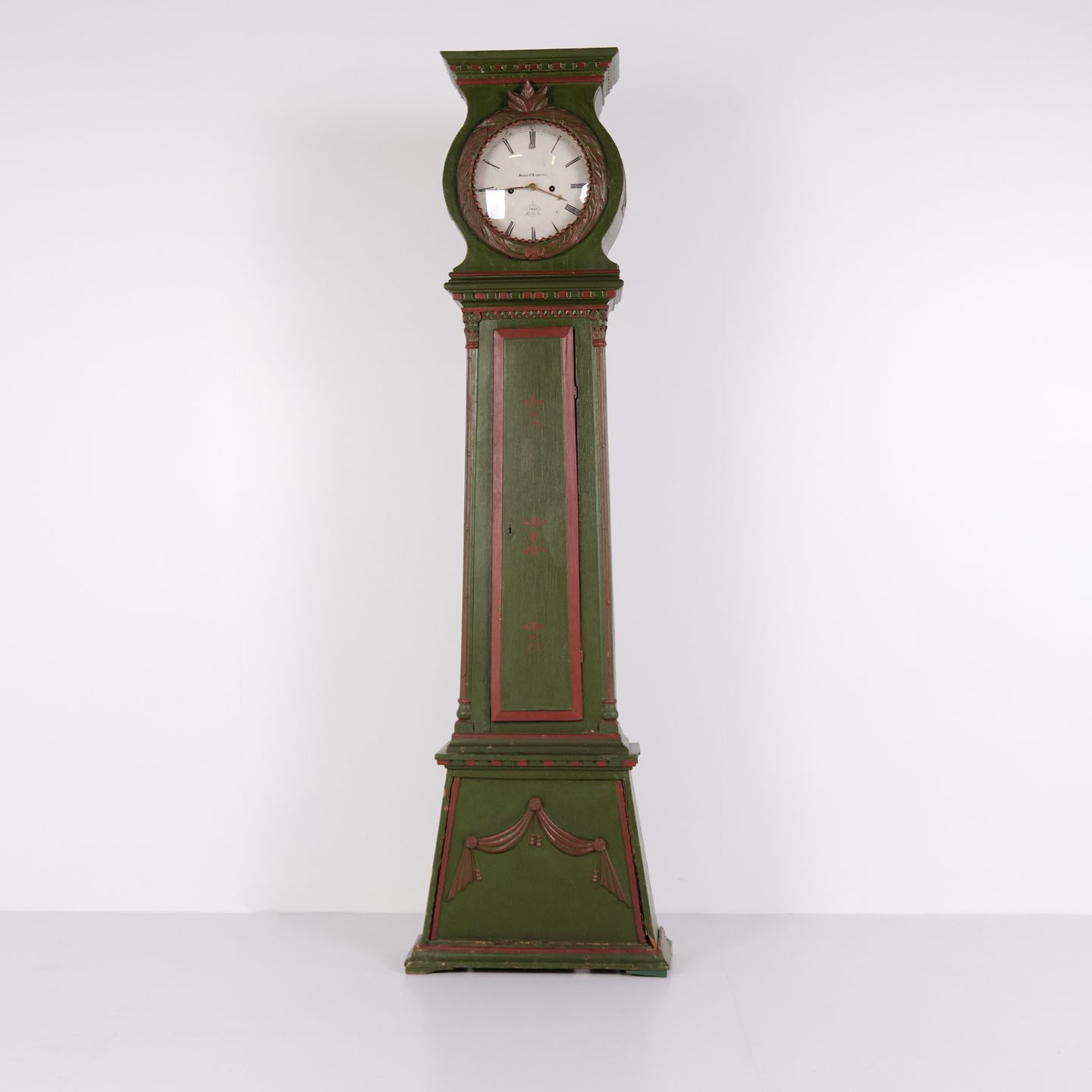 Bornholm longcase clock “frøken” model from the 1860s, hand-painted with carved details in green/red paint. Antique Bornholm clock from the 19th century.