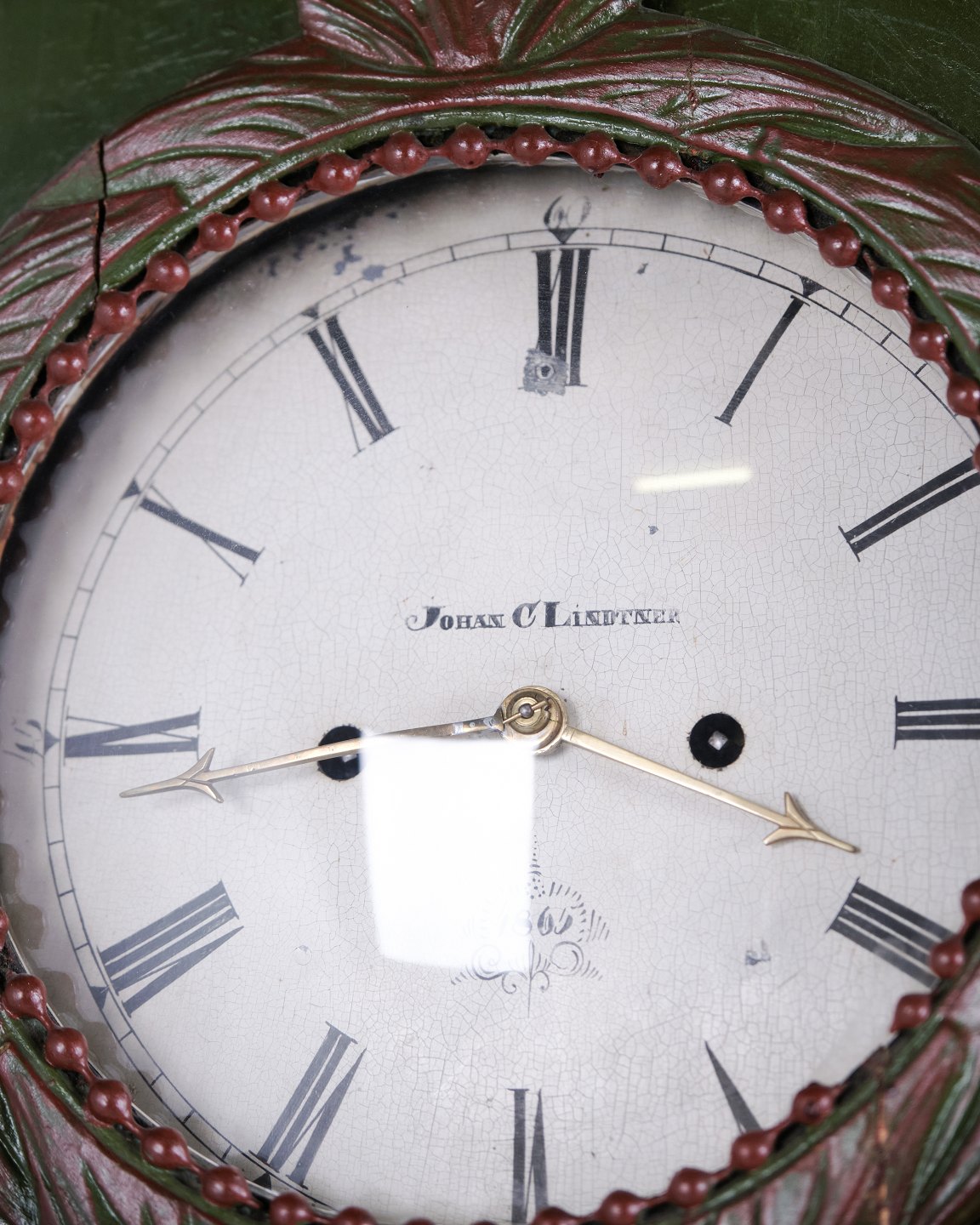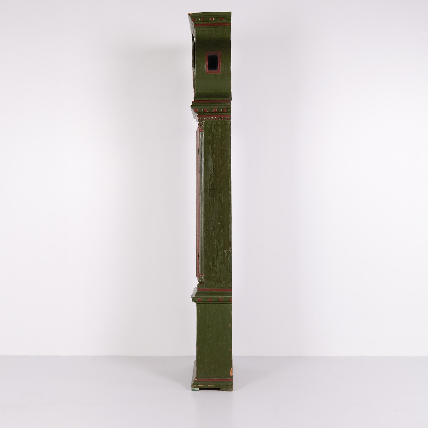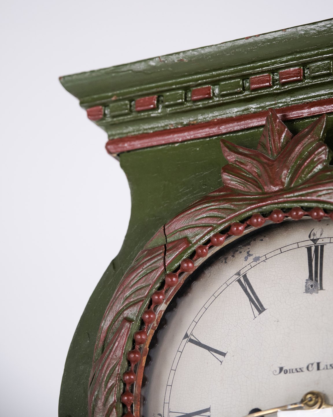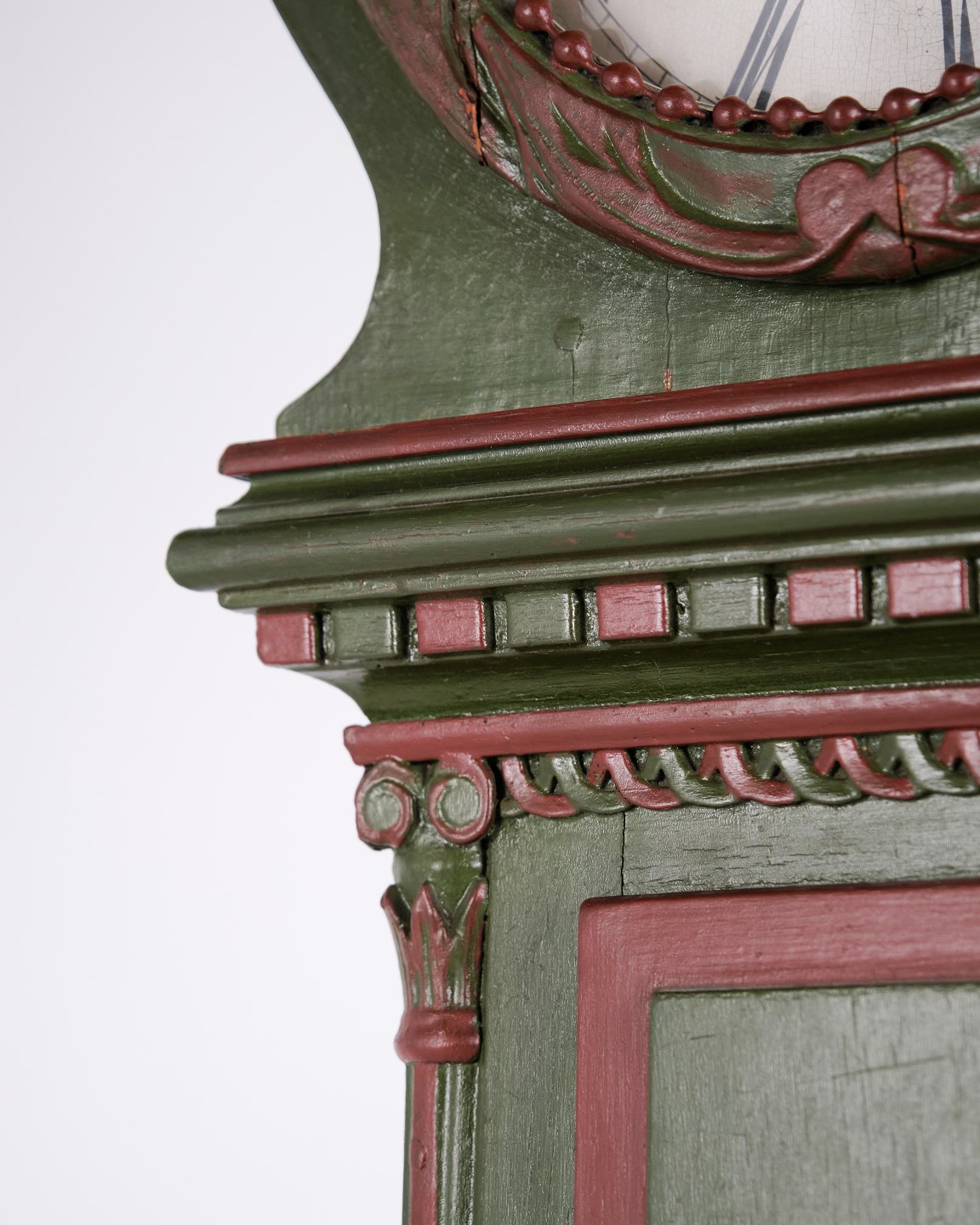 Bornholm longcase clock “frøken” model from the 1860s, hand-painted with carved details in green/red paint. Antique Bornholm clock from the 19th century.