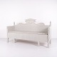 Antique storage bench from the 1860s in grey-painted pine wood with carved details and storage. Antique storage bench from the 19th century.