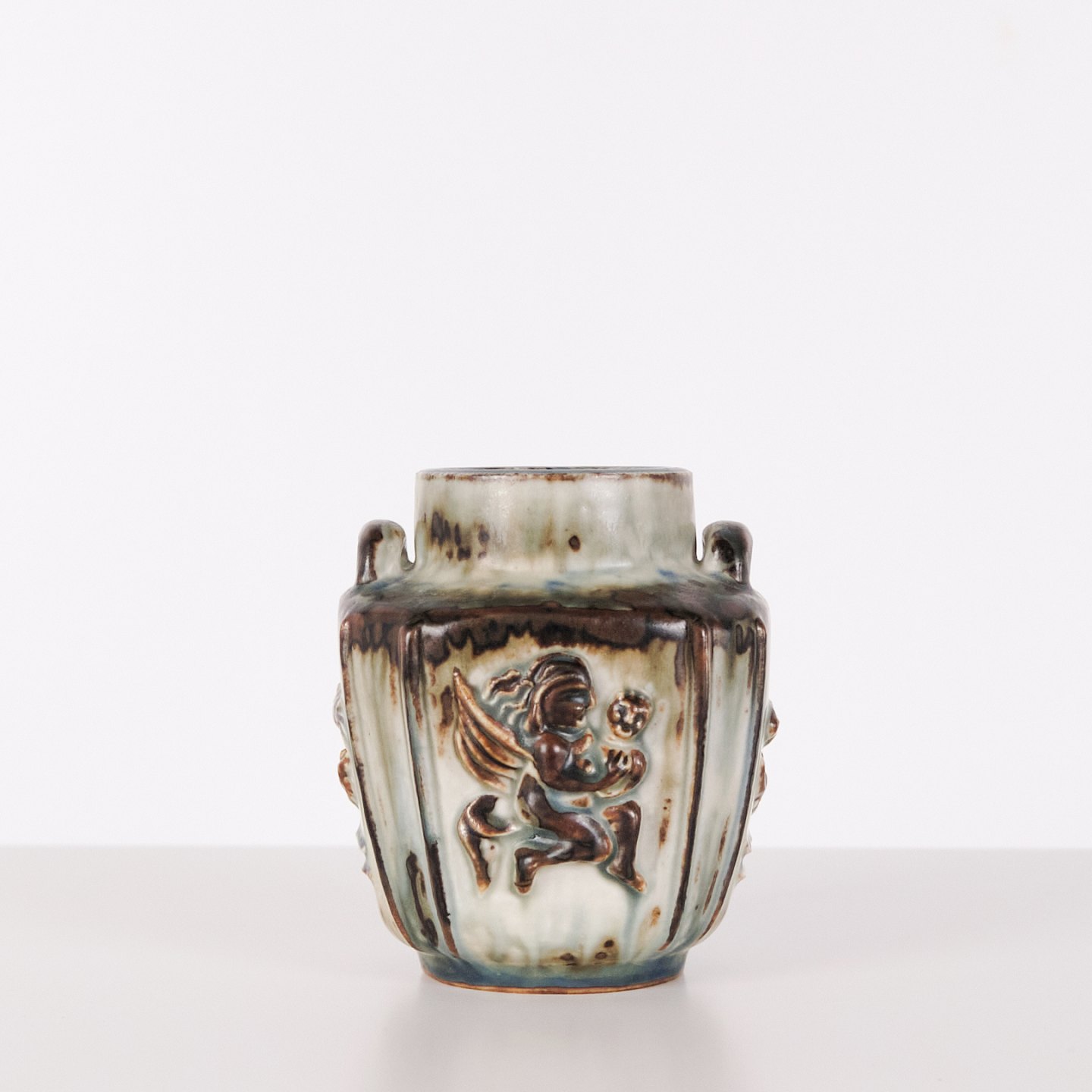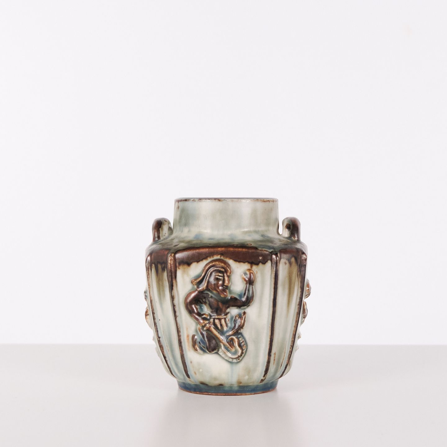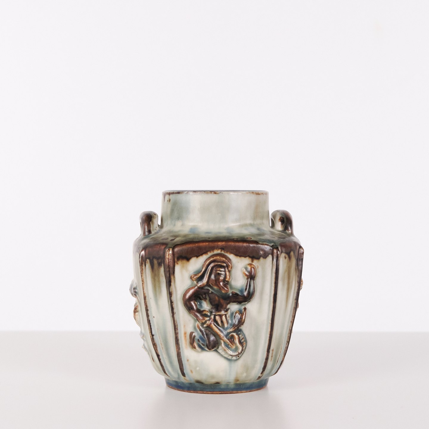Stoneware vase designed by Bode Willumsen for Royal Copenhagen. The vase is modelled with relief decoration and was produced at Royal Copenhagen in Denmark between 1969 and 1973. Marked with monogram and model number 20121. An example of Danish ceramic design from the late 20th century.