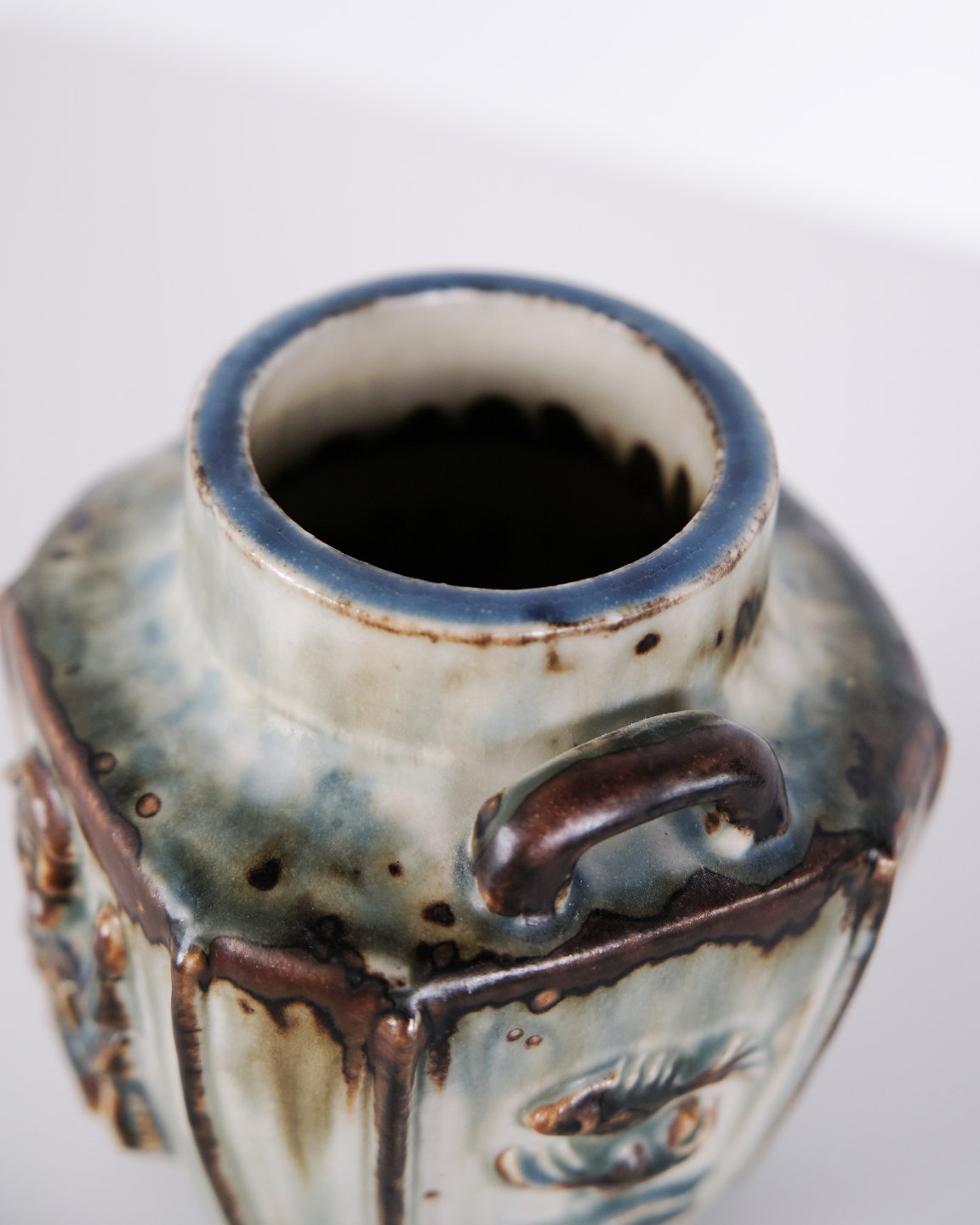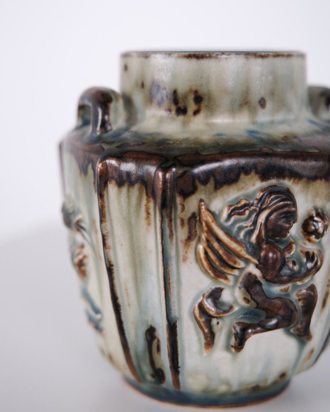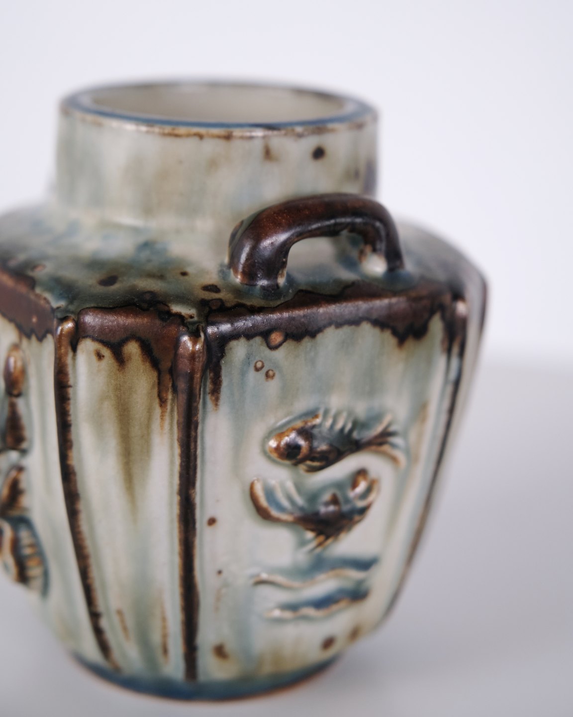 Stoneware vase designed by Bode Willumsen for Royal Copenhagen. The vase is modelled with relief decoration and was produced at Royal Copenhagen in Denmark between 1969 and 1973. Marked with monogram and model number 20121. An example of Danish ceramic design from the late 20th century.