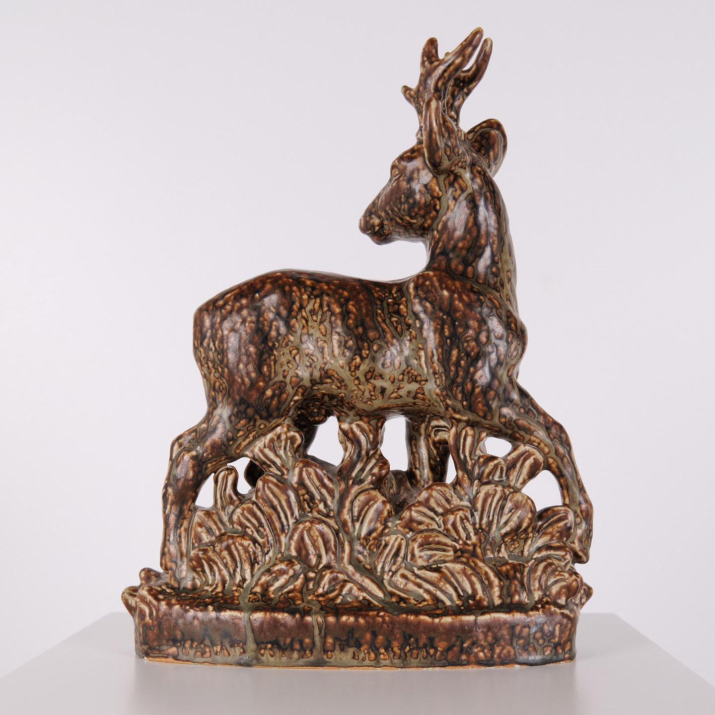 Stoneware figure depicting a standing deer, model no. 21333, designed by Knud Kyhn for Royal Copenhagen. The figure is executed in stoneware and belongs to Kyhn’s animal sculptures produced at Royal Copenhagen in the mid-20th century.